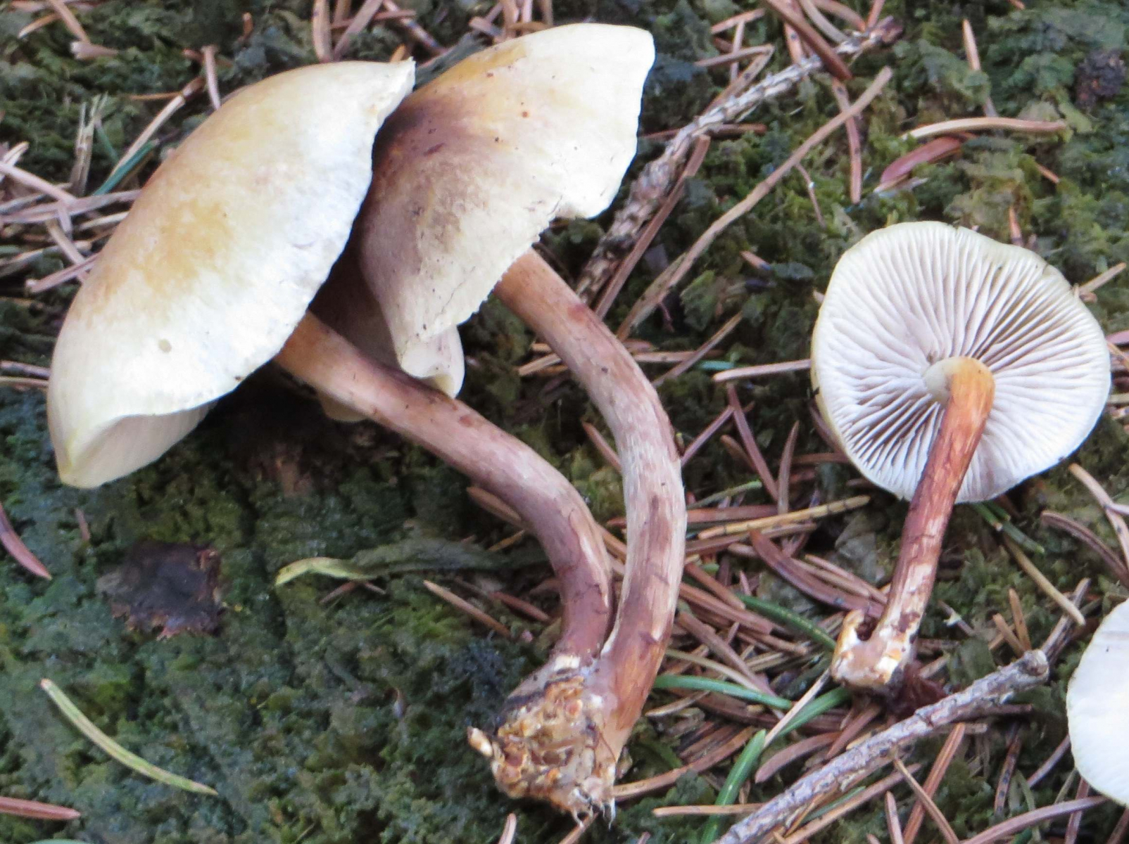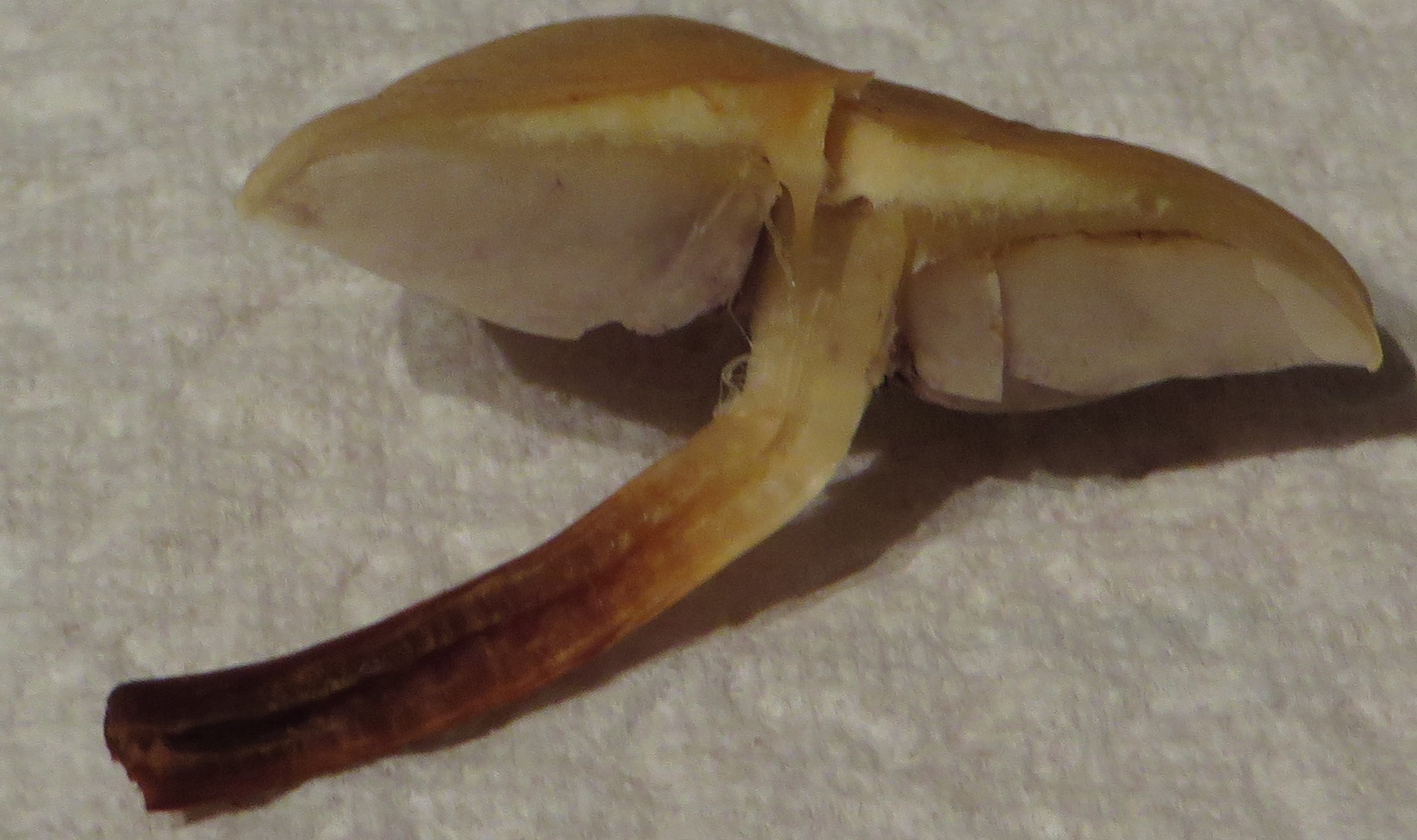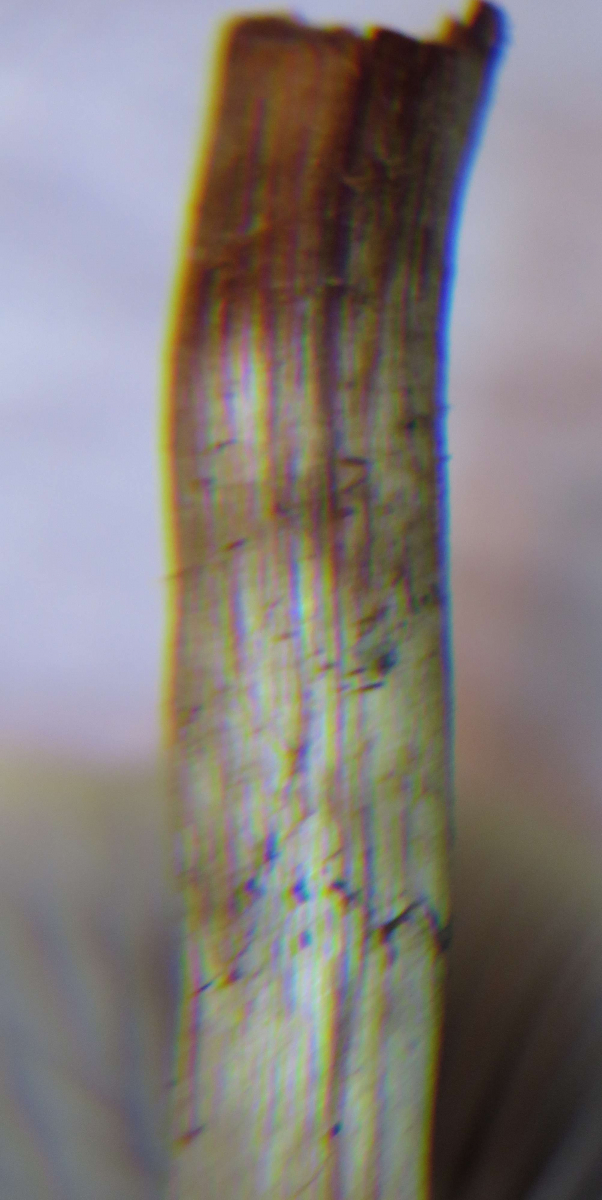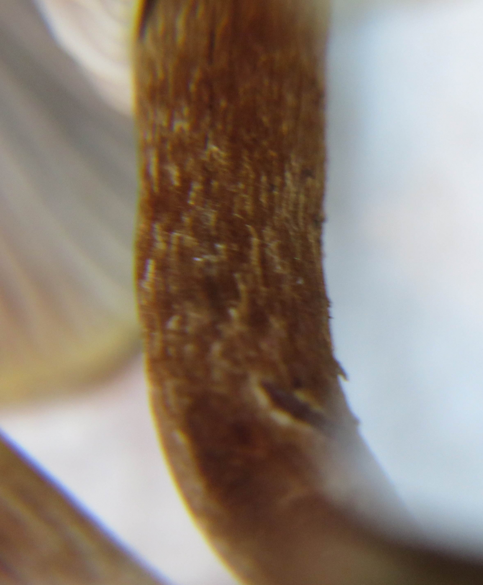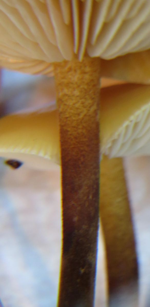 Stiele: oben etwas gelb, weiter unten rasch braun, etwas längsgerillt, stellenweise etwas weißlich überfasert; kein Ring erkennbar, zylindrisch, oft gekrümmt