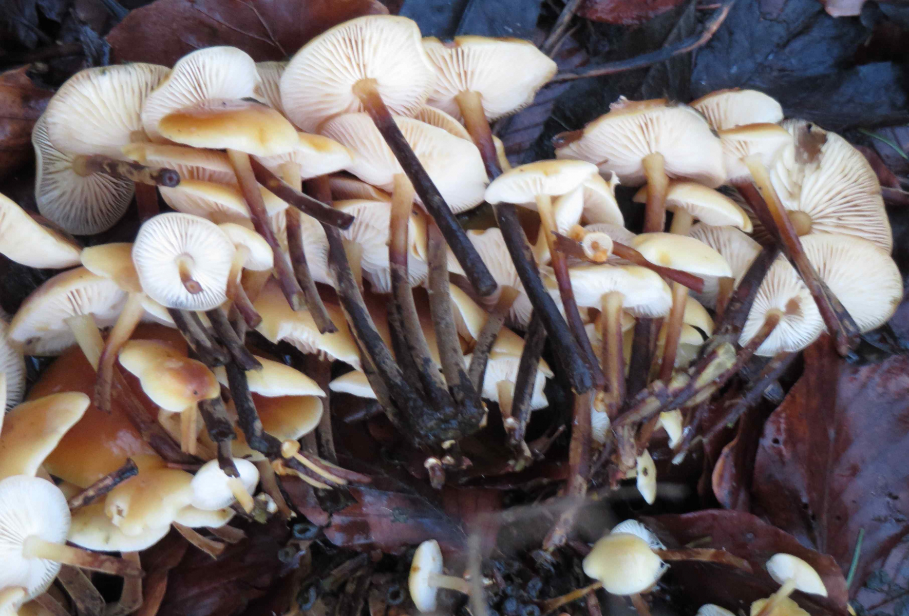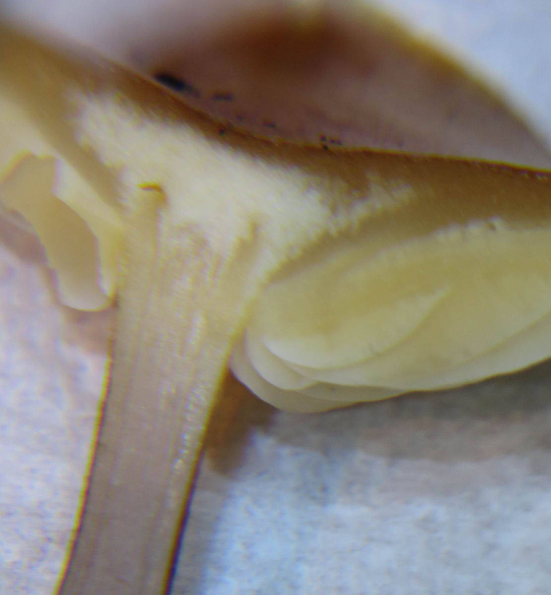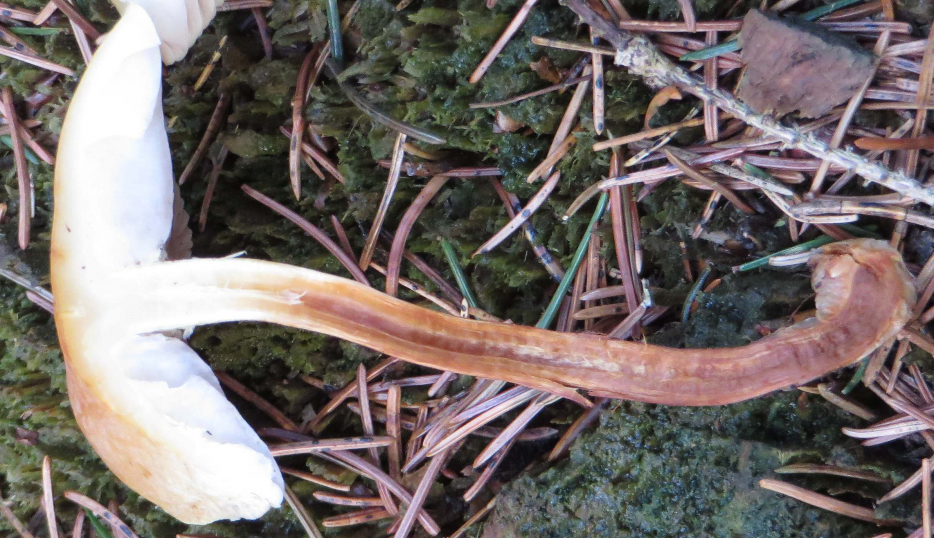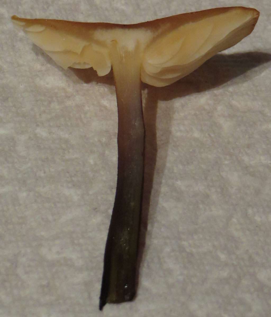 Stiele: oben etwas gelb, weiter unten rasch braun, etwas längsgerillt, stellenweise etwas weißlich überfasert; kein Ring erkennbar, zylindrisch, oft gekrümmt