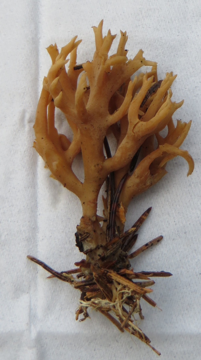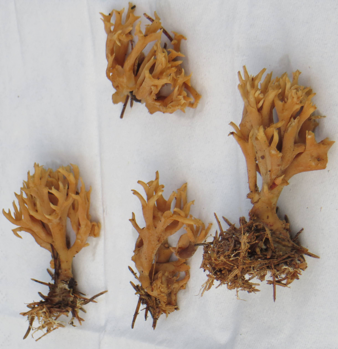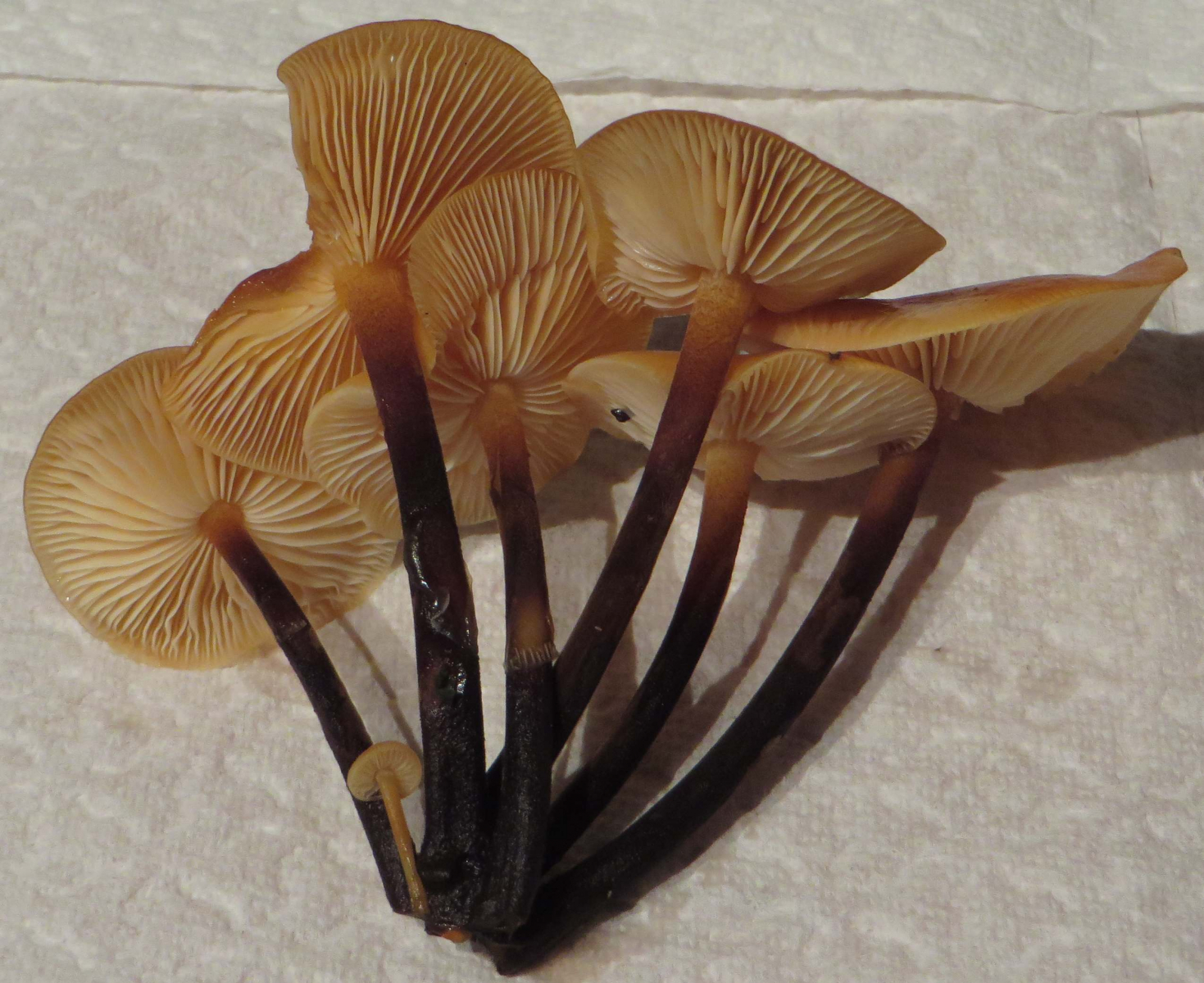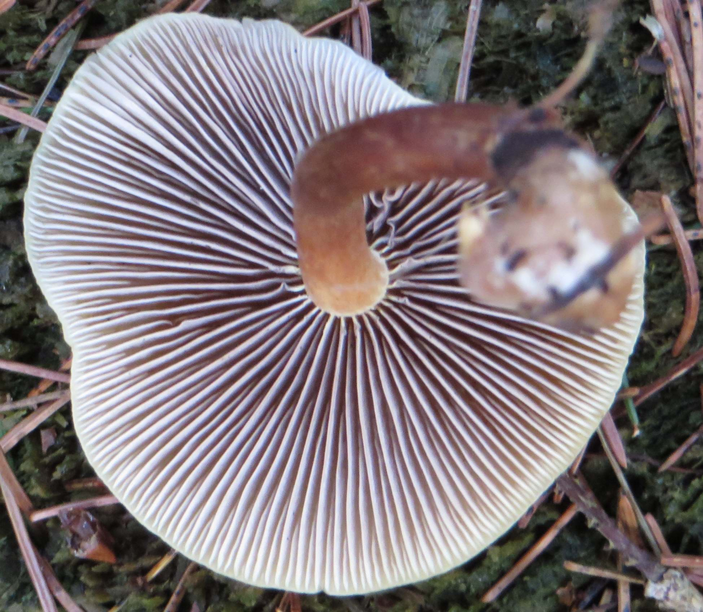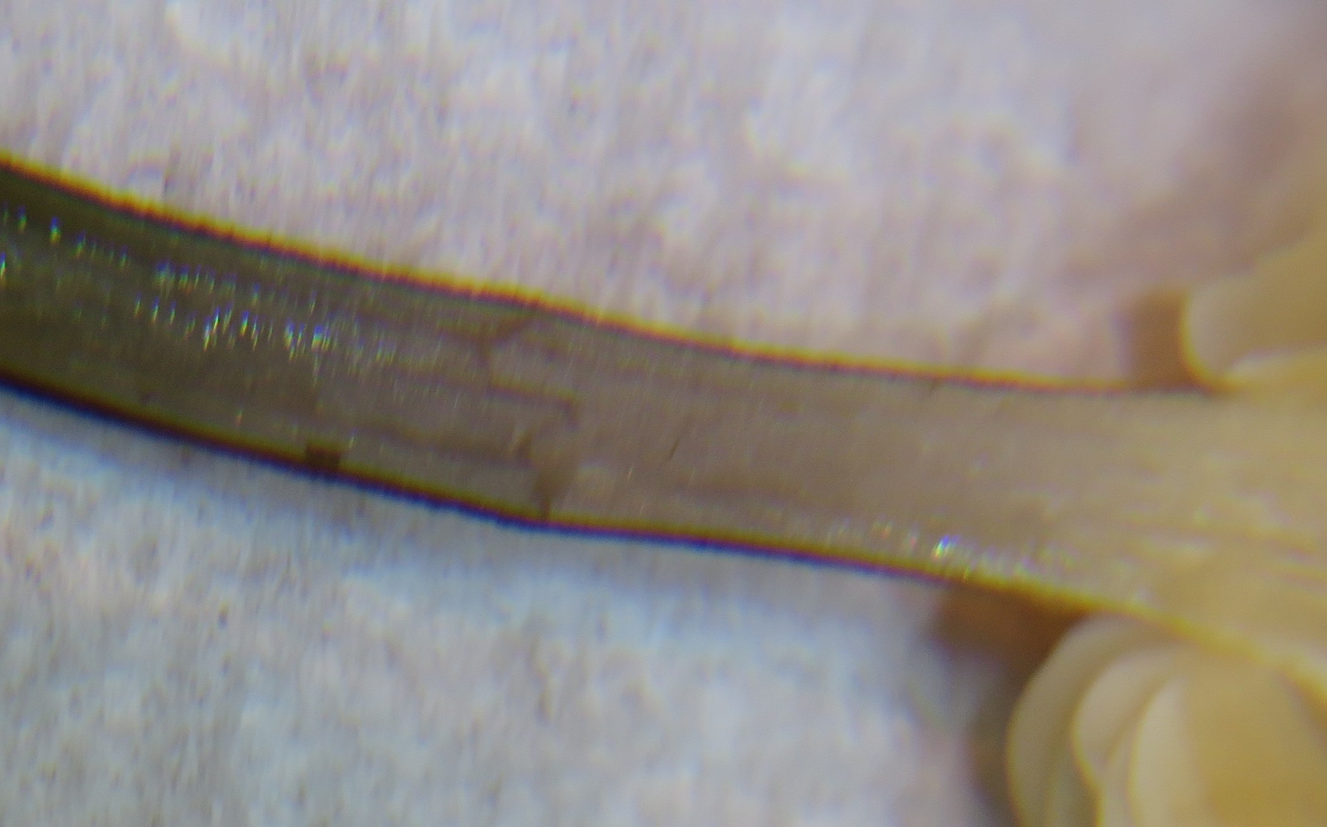 Stiele: oben etwas gelb, weiter unten rasch braun, etwas längsgerillt, stellenweise etwas weißlich überfasert; kein Ring erkennbar, zylindrisch, oft gekrümmt