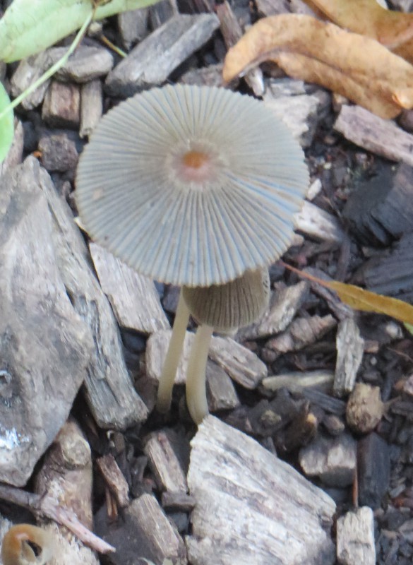 Am gleichen Tag am Wegrand in einem parkähnlichen Gelände hübsche Tintlinge, evtl. der gemeine Scheibchentintling (Parasola plicatilis):