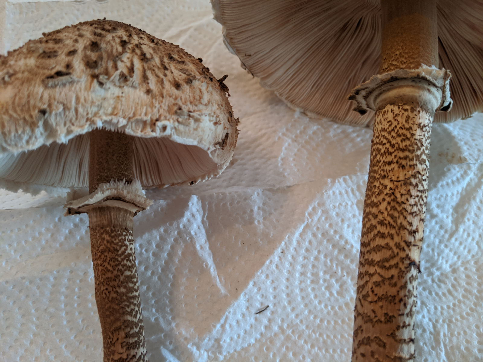 habe ich hier zwei Parasolpilze (Macrolepiota procera)? Der Ring ist nicht verschiebbar, er liegt zu eng um den Stiel. Geruch sehr dezent. In der Nähe wachsen wohl auch Safranschirmlinge oder ähnliches.