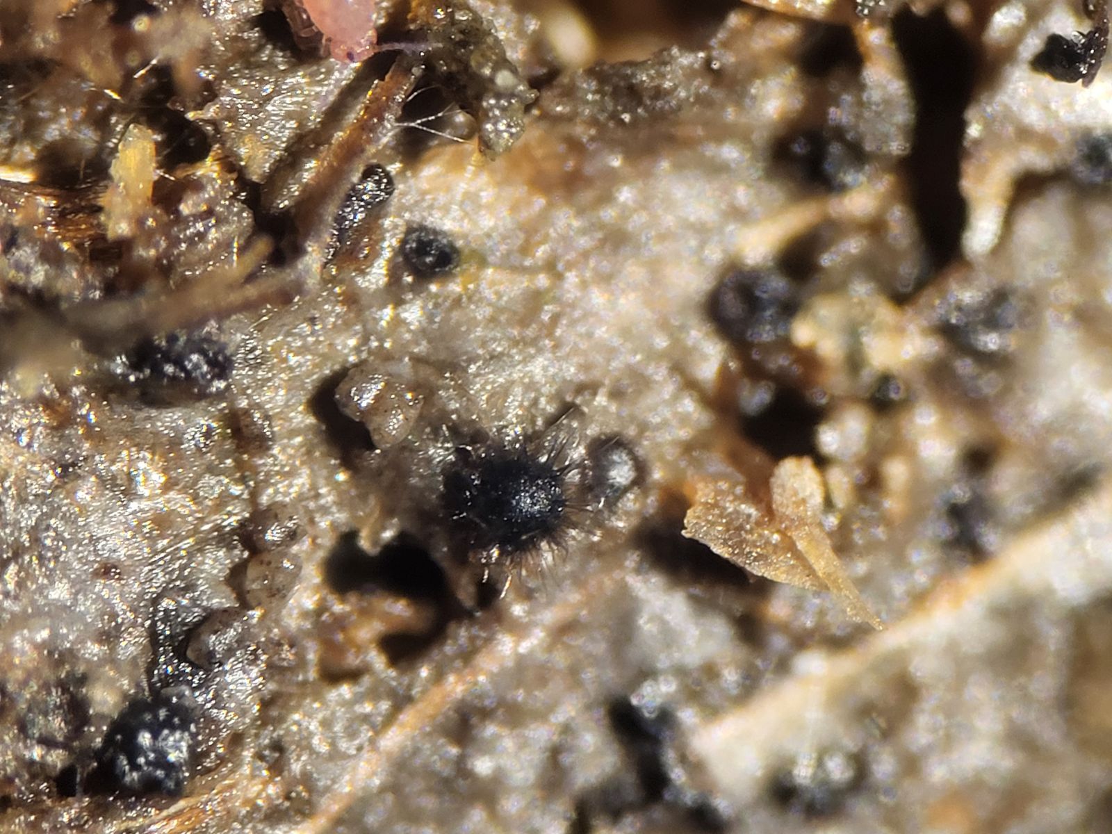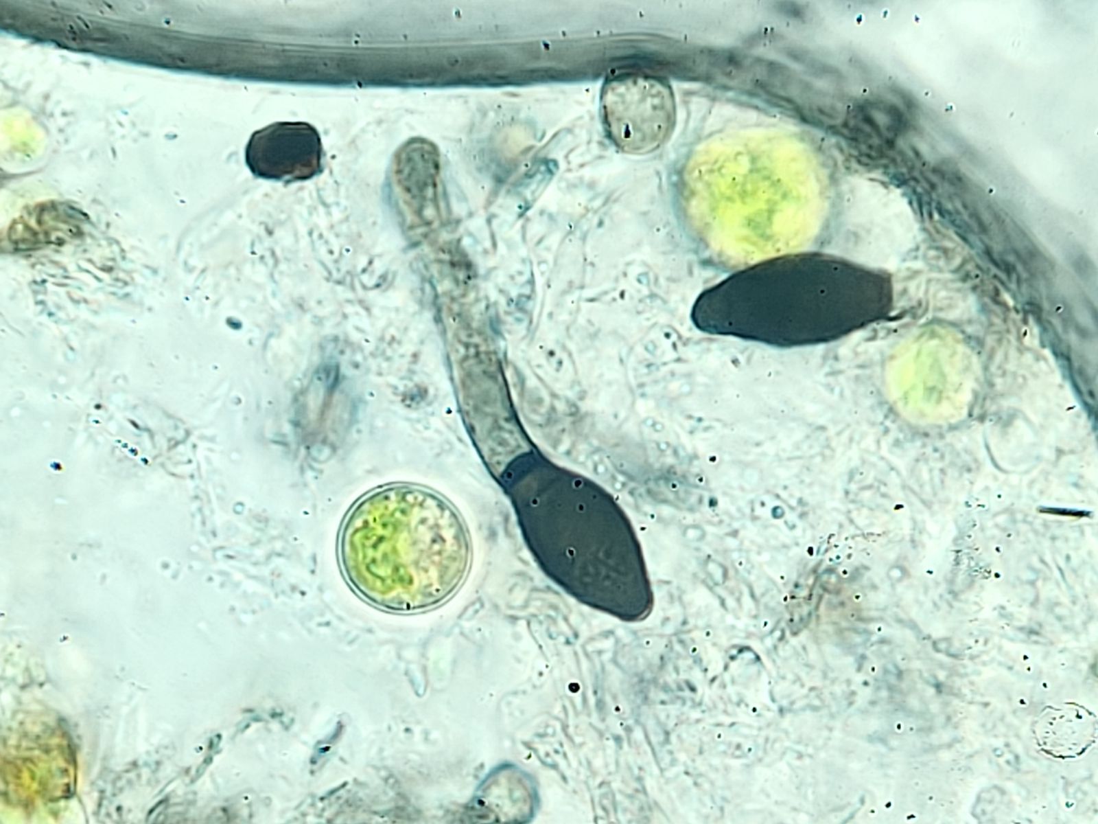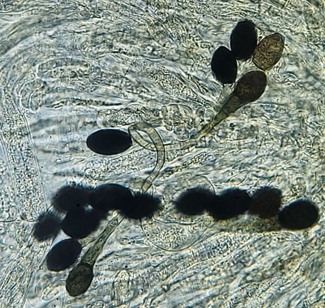 1. Eine Chaetomium (oder eine verwandte Gattung) auf Birkhuhn. Die Fruchtkörper sind etwas länglich und dicht mit gräulichen Haaren überzogen. Die Haare sind mikroskopisch rau, unverzweigt und teils korkenzieherartig aufgerollt. Die Mikromerkmale finde ich ansonsten so bemerkenswert, dass ich darauf hoffe, dass die Art bestimmbar ist: Die Asci sind zylindrisch und die Sporen haben eine sehr auffällige Form, die ich als limoniform betrachten würde. Gemessen habe ich die reifen Sporen mit 10, - 11,3 x 6,8 - 8 µm.