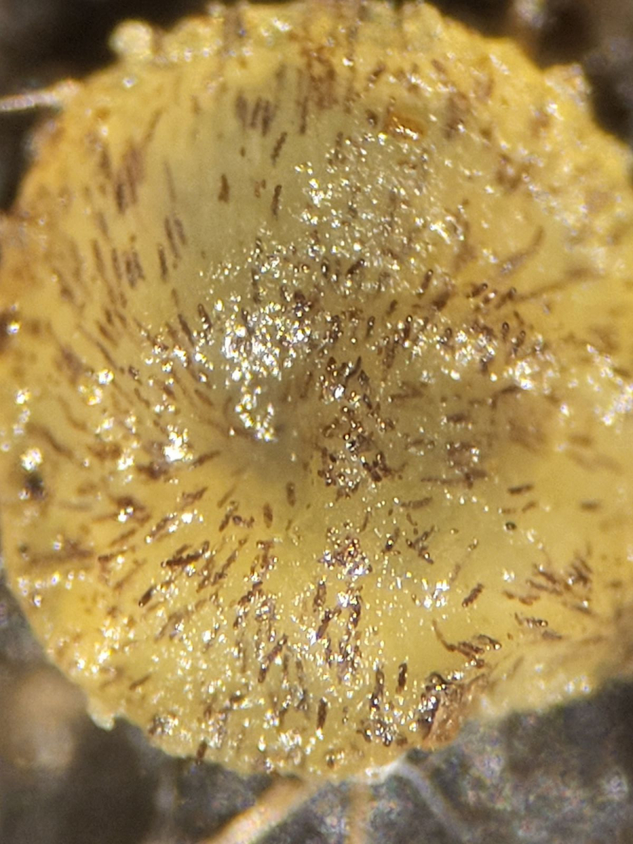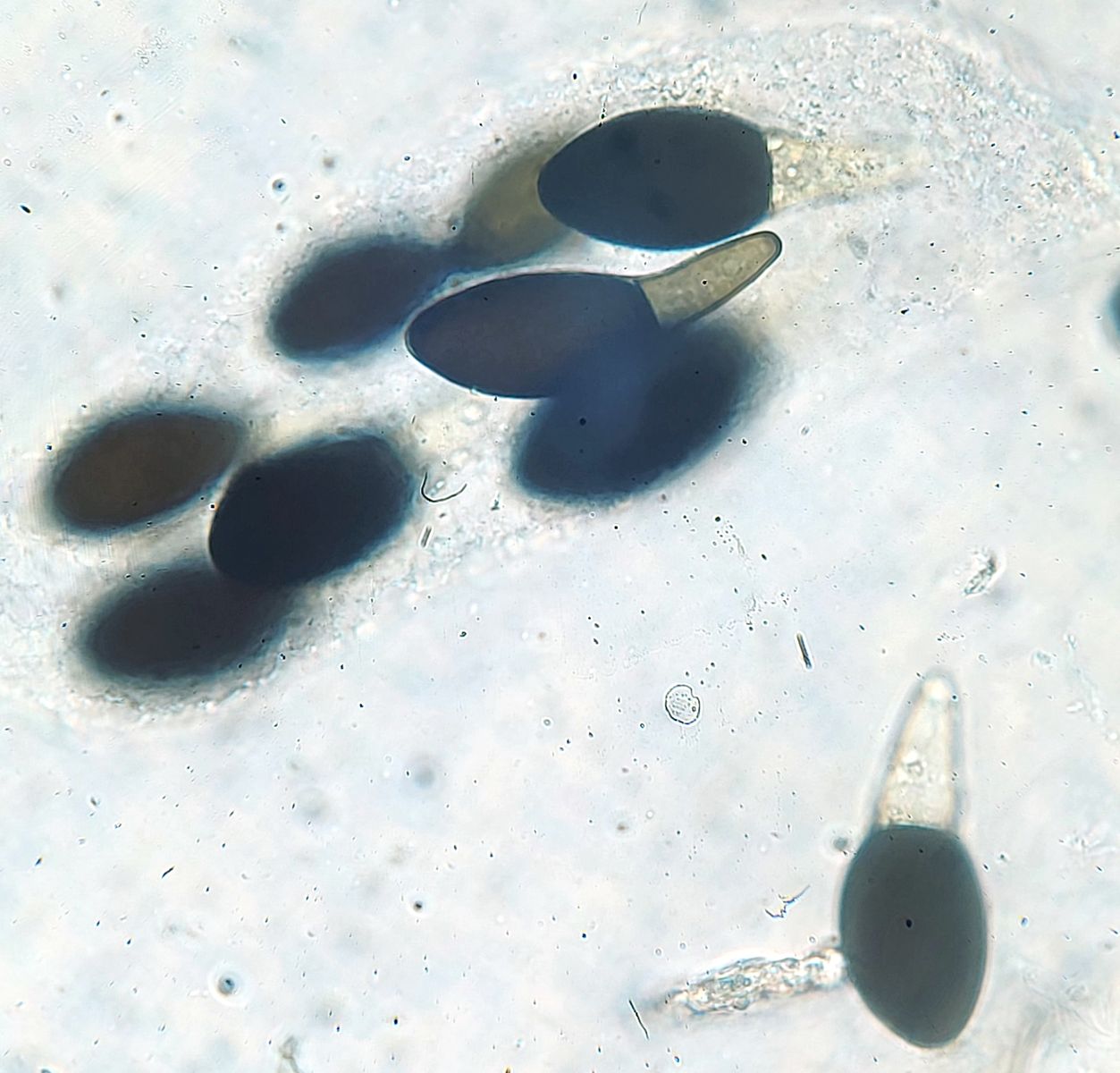 Etwas Kopfzerbrechnen bereitete mir der folgende Fund, da ich die Art bisher nicht mit so losen Sporenclustern gesehen hatte. Die Sporenmaße passen allerdings und Björn bestätigte, dass die Art auch mal dergestellt auftreten kann: Saccobolus depauperatus