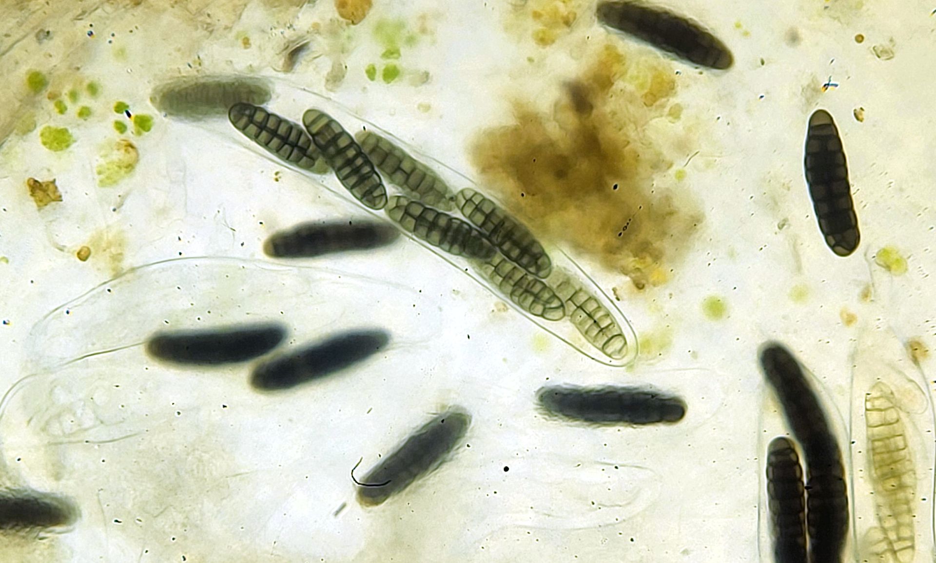 Ein besonders schöner Fund gelang mir dann auf Pferd. Bislang hatte ich erst eine Art mit mehr als 4 Zellen pro Spore gefunden (Sporormiella affinis), dies ist nun Nummer 2: mit 7 Zellen pro Spore hört die Art auf den Namen Sporormiella heptamera