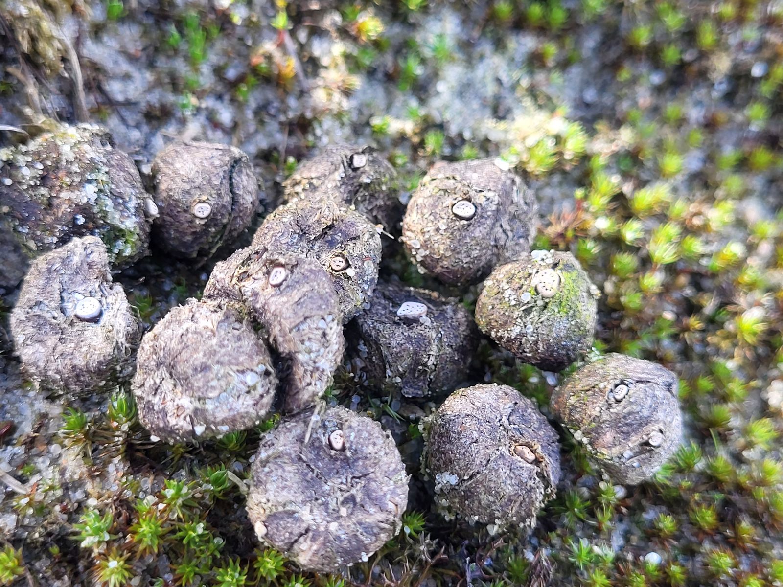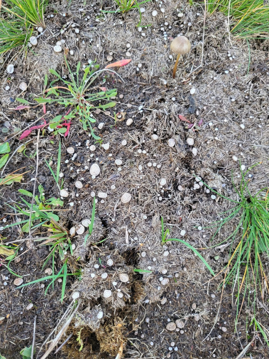 Peter fand dann überraschend einen Hasenköttel mit einer Art, die bisher aus dem Gebiet noch nicht bekannt war: Poronia ericii! Zusammen besuchten wir dann am Folgetag eine weitere interessante Stelle, an der wir nach einigem Suchen dann ein größeres Vorkommen der Art an mehreren Köddeln feststellen konnten: