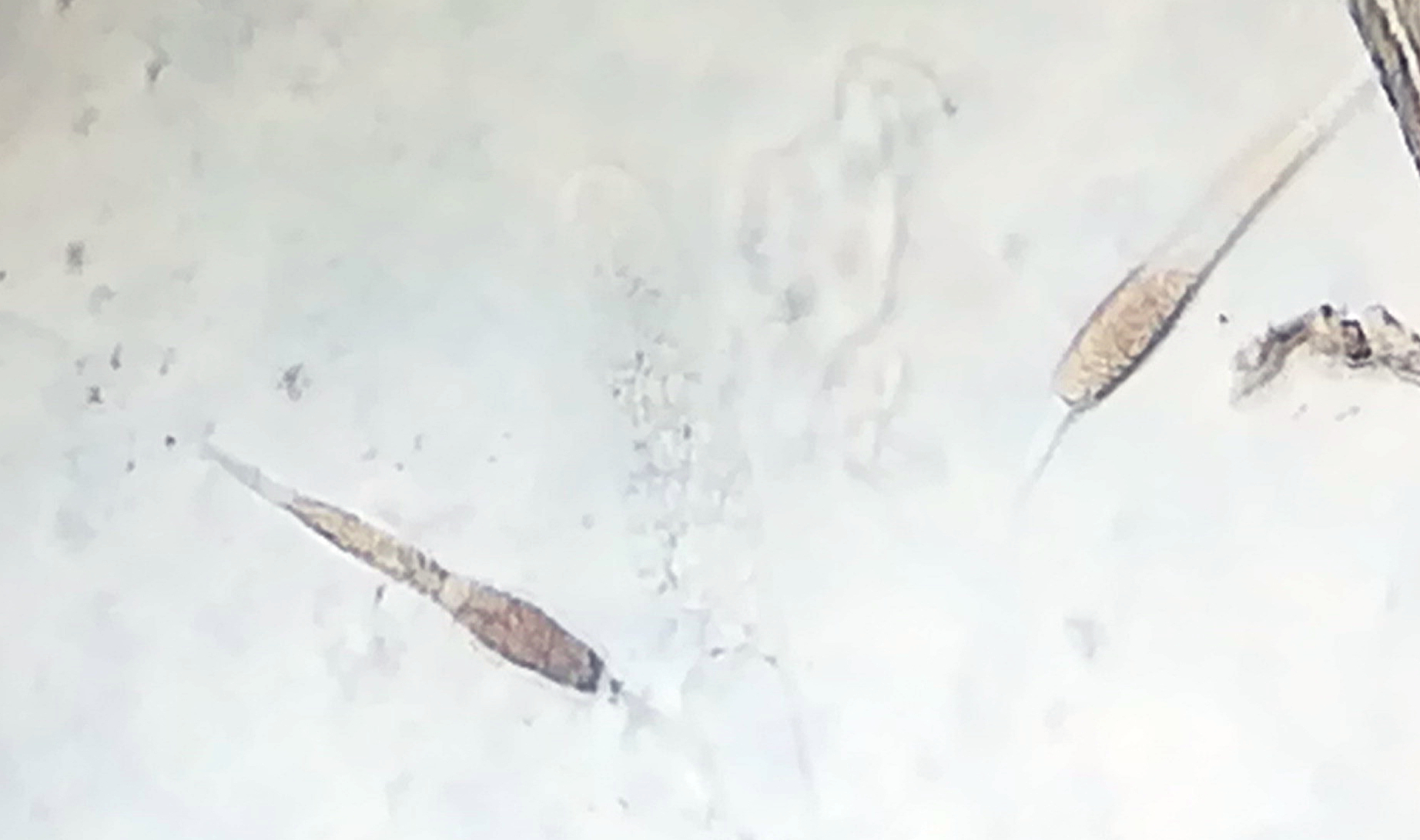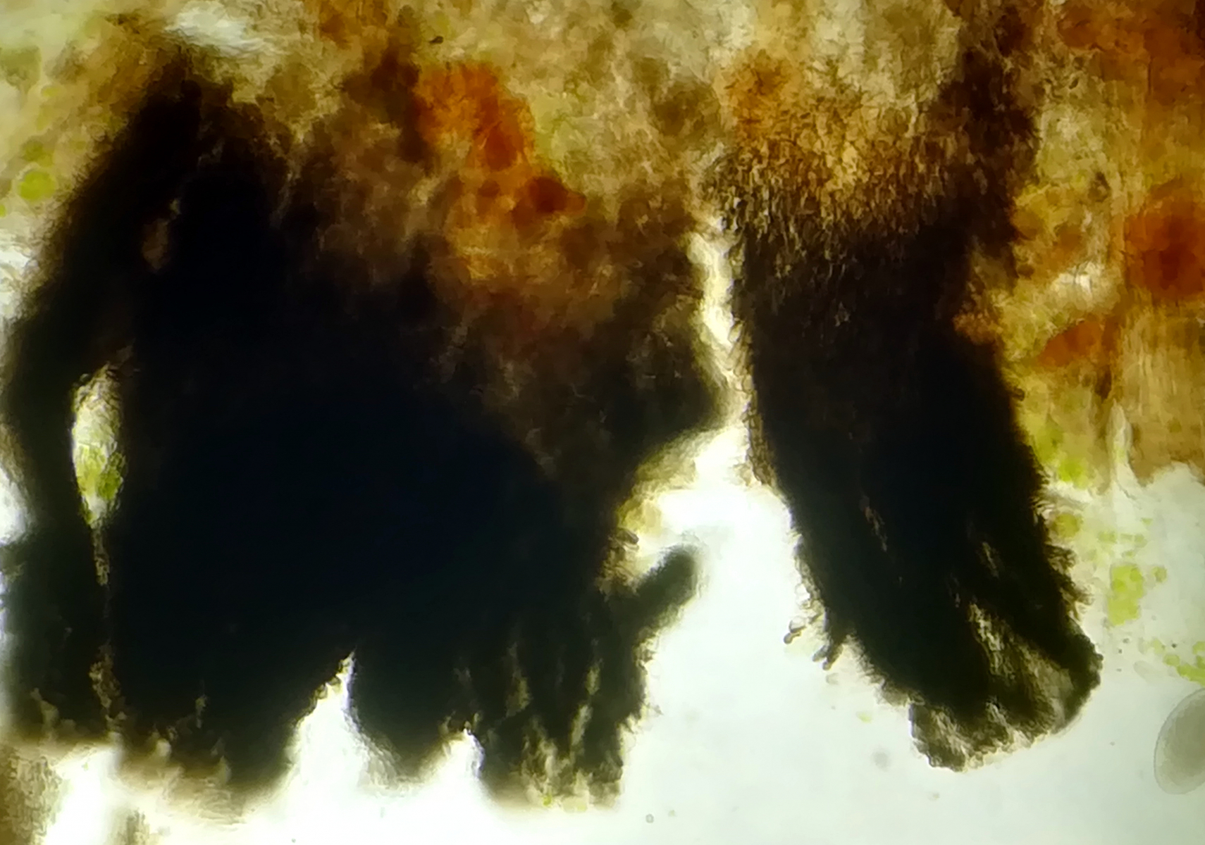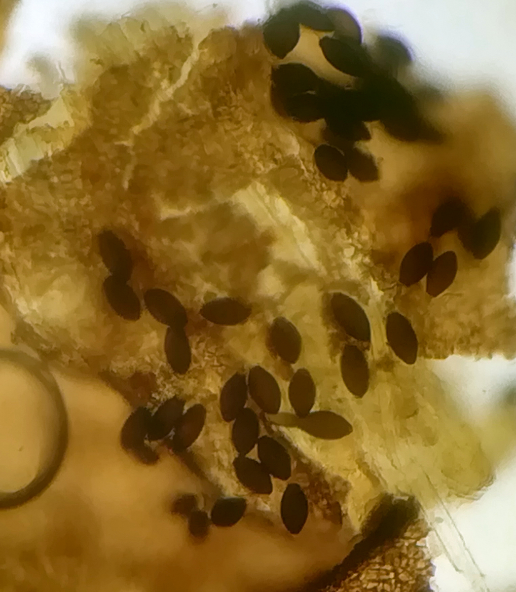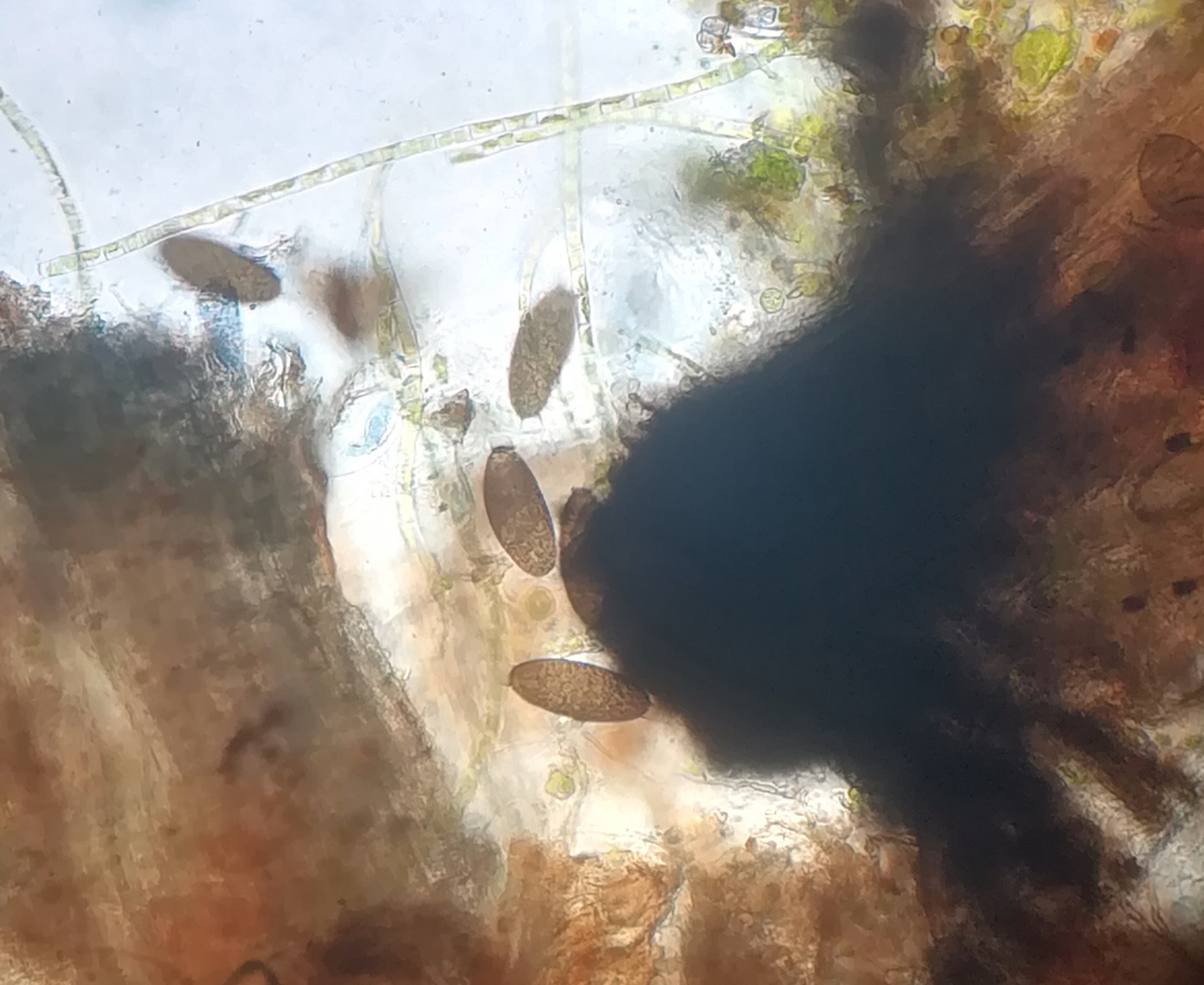 - Die Sporen habe ich mit 9,5 - 10,7 x 7 - 8,5 x 5 - 5,7 µm gemessen. Sie sind von einer dicken Gelhülle umgeben und die Keimspalte zieht sich über die komplette Länge der Sporen