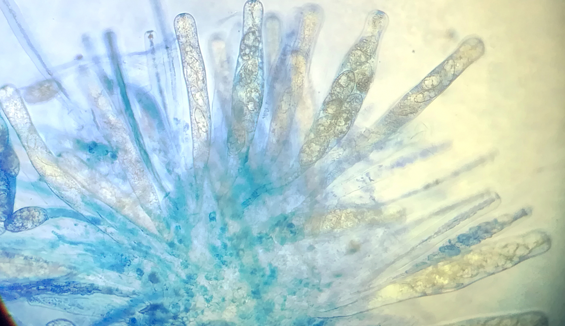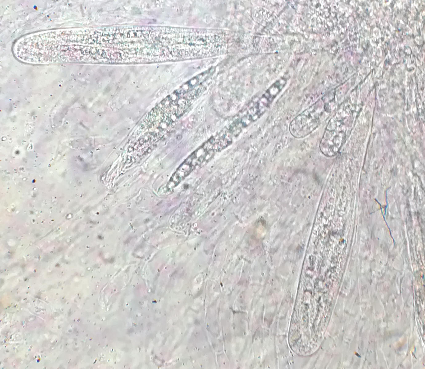 - Die Asci sind 8-sporig, wobei die Abstände zwischen den Sporen recht groß sind. Die Asci sind uniseriat, die Sporen sind tendentiell eher in Längsrichtung ausgerichtet