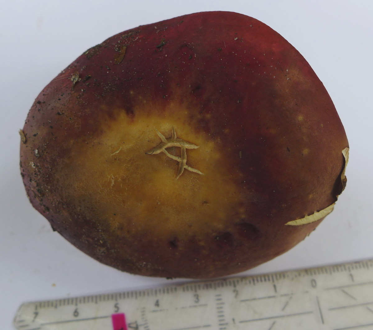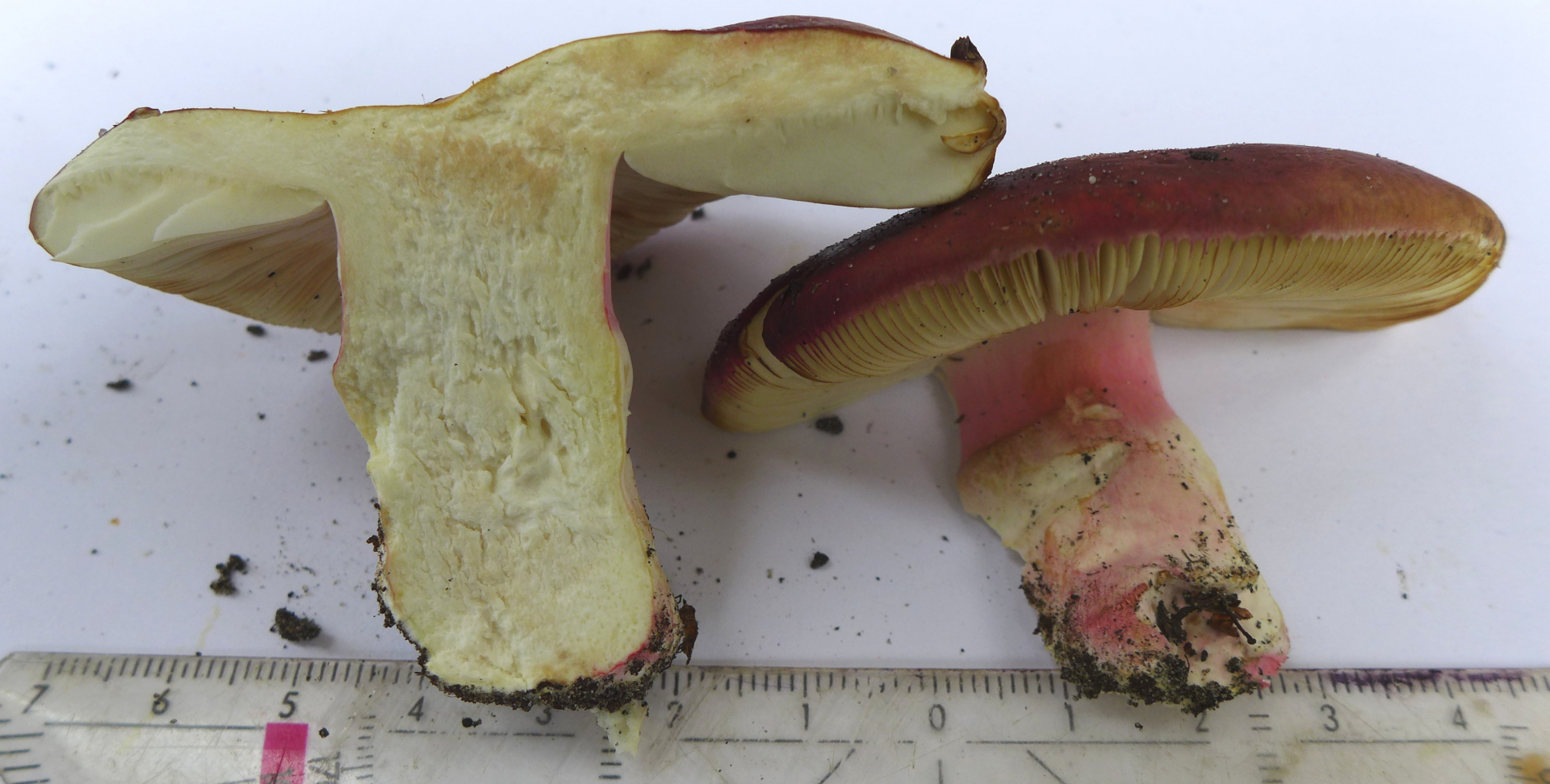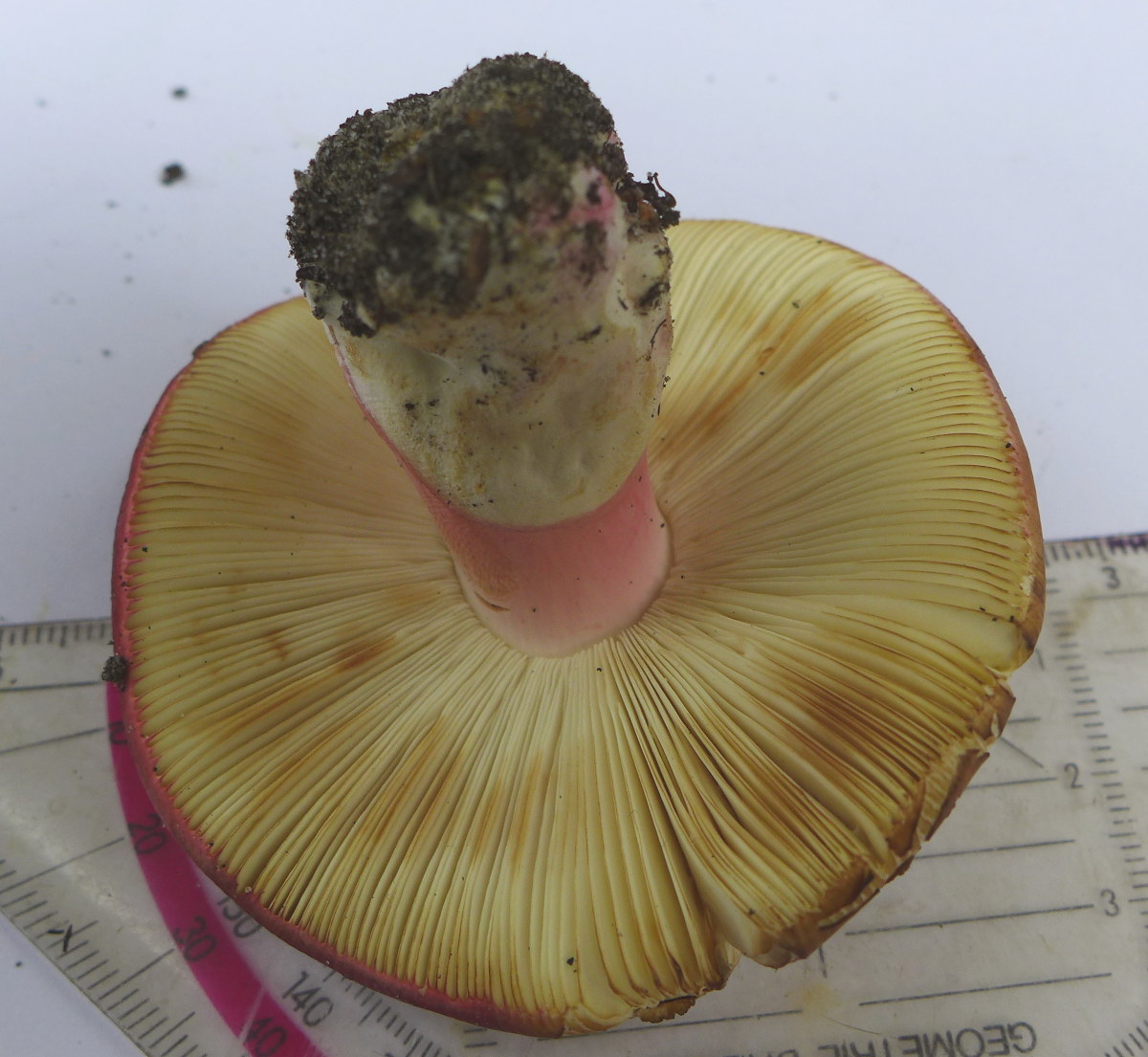 Mehrfach ist mir eine hellfleischige Art mit gelblichem Hut und violetten Lamellen untergekommen, die ich aber auch nicht benamsen konnte. Ich würde ihn am ehesten zu den Schleimköpfen sortieren. Der Stiel war nicht schleimig und der Hut auch nur leicht klebrig, kein unangenehmer Geruch. Lamellen bei alten Exemplaren braun, aber das ist wohl für die ganze Gattung nicht ungewöhnlich.
