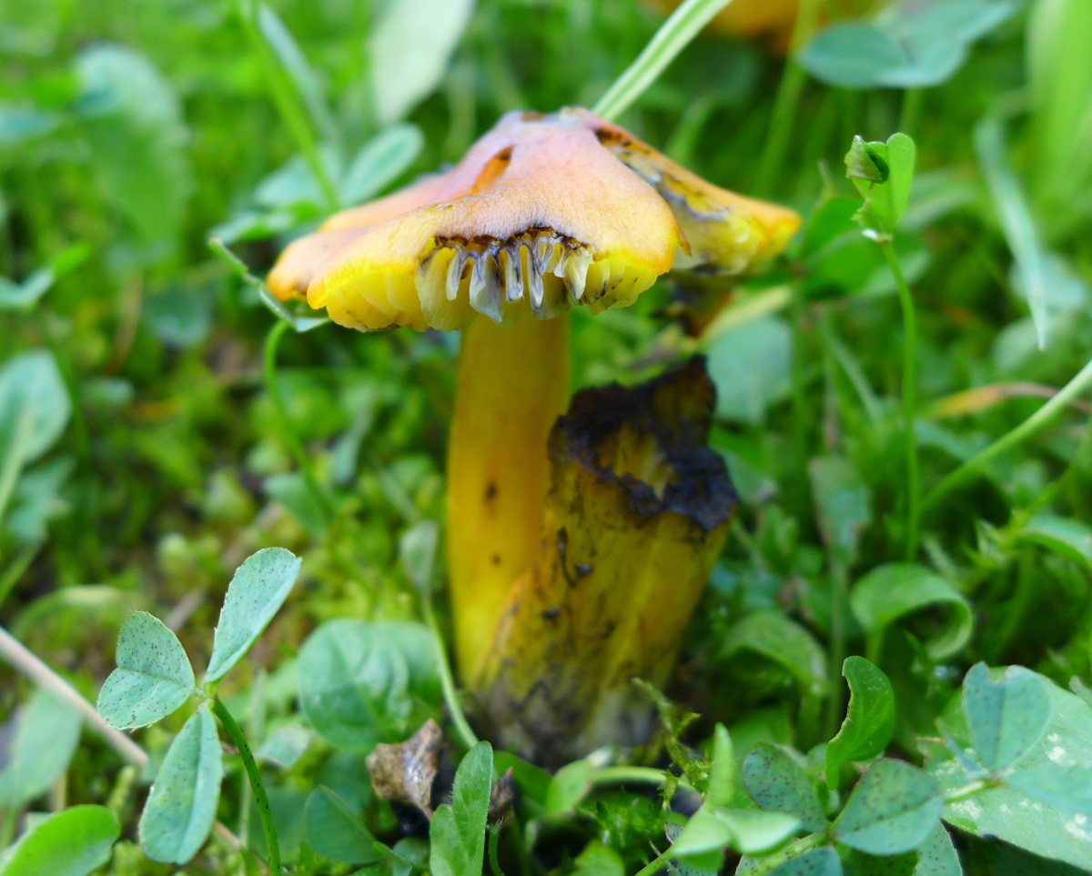 Meine allerersten Saftlinge! Zwar "nur" der relativ verbreitete schwärzende, aber ich habe mich trotzdem so gefreut, dass ich kein scharfes Bild hinbekommen habe. Da müssen wir jetzt durch. Ich bin später noch einmal an die Stelle, aber da gab's außer dunklen Flecken im Gras nichts mehr zu sehen.