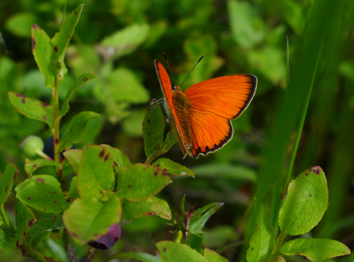 Das könnte Richtung Feuerfalter gehen, evtl. männlicher Dukaten-Feuerfalter? Eine vermeintlich andere Art am selben Ort war schwarz-orange gefleckt, mutmaßlich die Weibchen dazu.