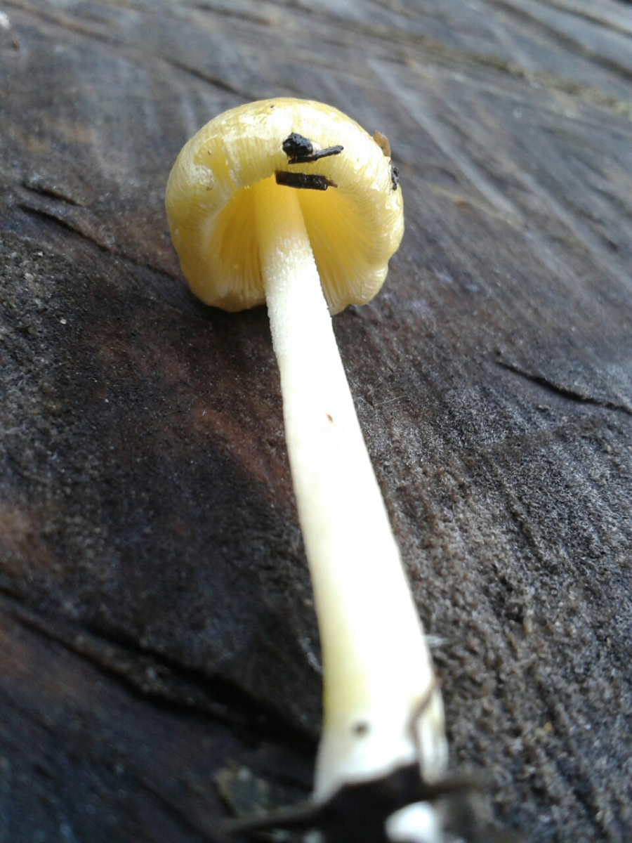 Das Velum war teilweise noch komplett geschlossen, Unterseite ganz fein flockig. Die Lamellen stehen sehr eng, und die größten hatten ca. 6 cm Ø. Gurkengeruch vorhanden, Sporenpulver wahrscheinlich braun, aber sehr spärlich (vielleicht kommt noch was raus). Standort am Fuß eines Komposthügels.Und über die kleinen sonnengelben habe ich mich gefreut, ich vermute den Goldmistpilz. Huthaut schleimig, Stiel blassgelb, weiß beflockt, auf Mulch/Holzhäcksel. Vom Stiel am Standort habe ich noch ein weiteres Bild, da ist aber der Hut unscharf. Ich war leider ohne Kamera unterwegs.