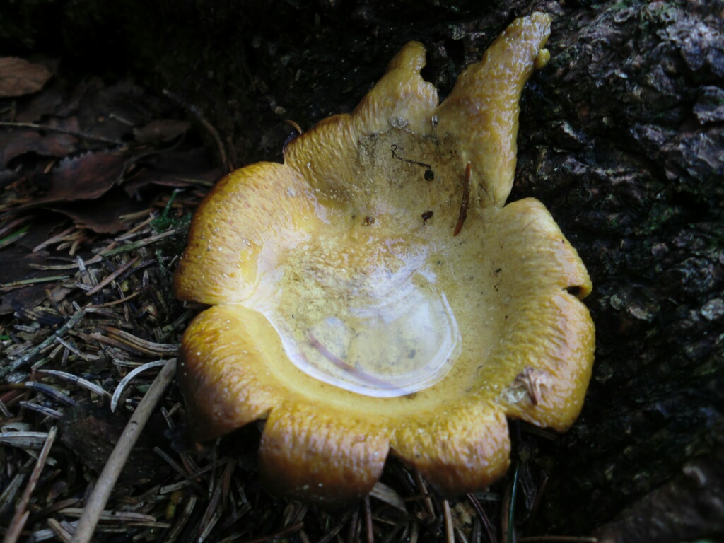 Es gab ansonsten nicht allzu viele Pilze, noch andere Tintlinge in großer Zahl an einer einzigen Stelle, ein paar Nachzügler vom rauchblättrigen Schwefelkopf. Aber der hier hat meine Aufmerksamkeit angezogen: ein billiges Imitat eines Kronenbecherlings, umgebaut zur Elfenbadewanne.