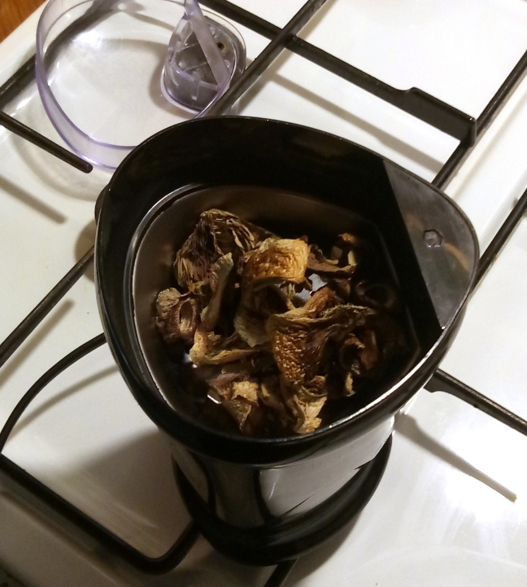 Bei den getrockneten handelte es sich um 2 oder 3 Edel- und einen Fichtenreizker. Diese in der Schlagmühle fein zermahlen.