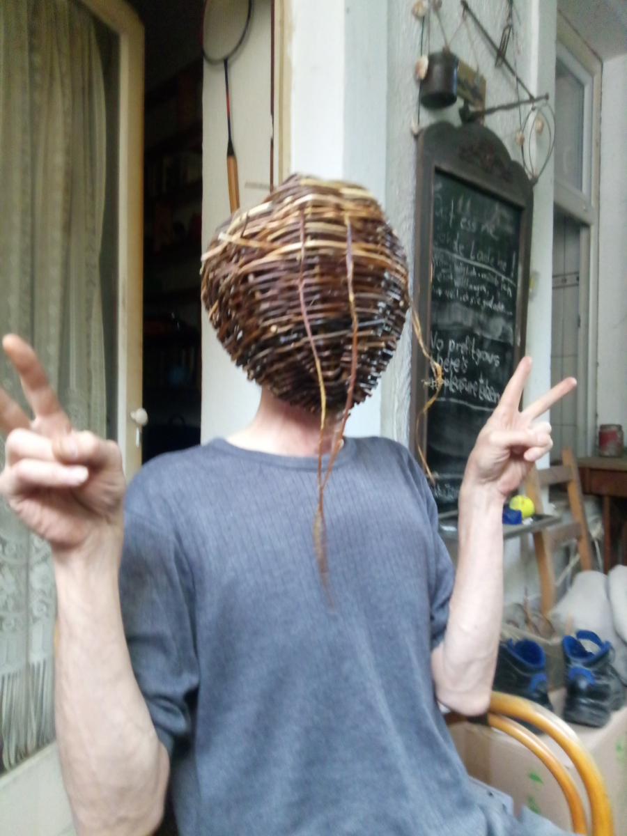 Der eigentliche Henkel des Grundgerüsts war eine Rute von ca. 5-6 mm Durchmesser. Die habe ich aber in der Endfertigung noch mit 3 dünnen umwickelt, so dass es insgesamt ca. 1 cm ist. Liegt eigentlich ganz gut in der Hand.