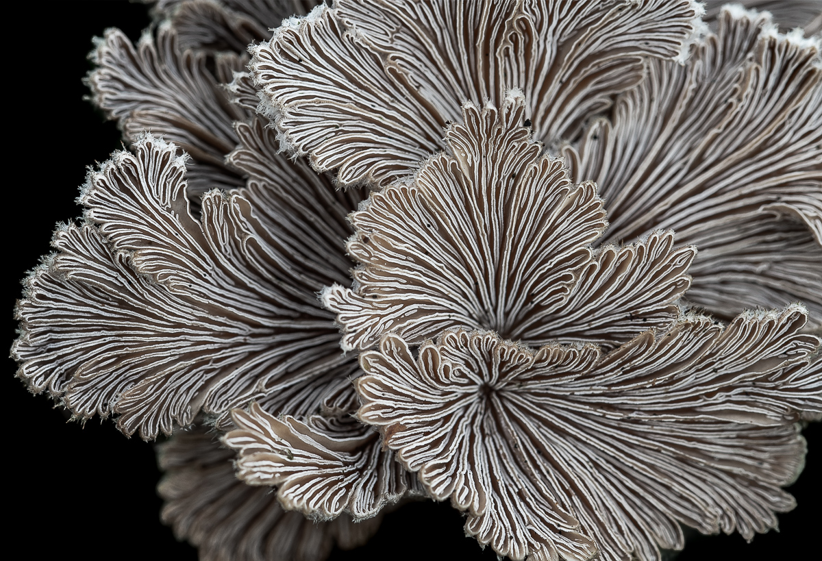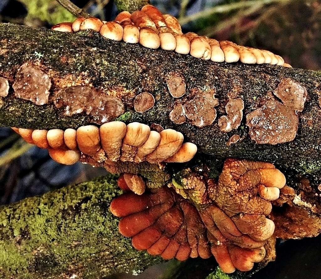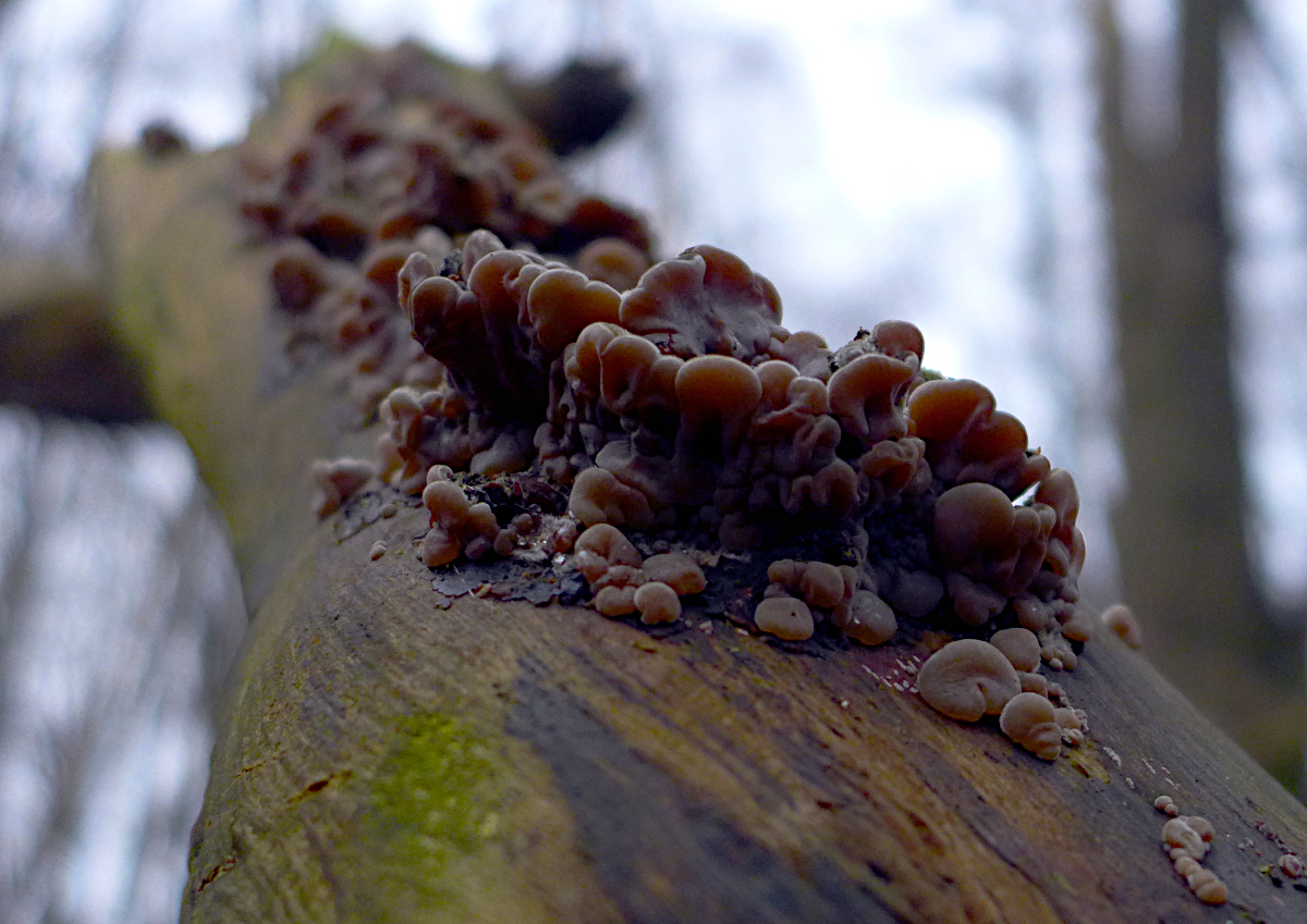 Inzwischen sind es ja doch schon einige mehr. Den blauen Rindenhelmling auf Erle habe ich auch fotografiert. Bloß nicht halb so schön. Den gezonten Ohrlappenpilz hatten wir hier noch nicht: