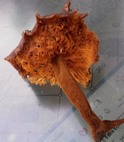 Der hier vorliegende Fruchtkörper ist auf der Unterseite leicht grau, und wie bereits angedeutet recht dünn bzw. flach.