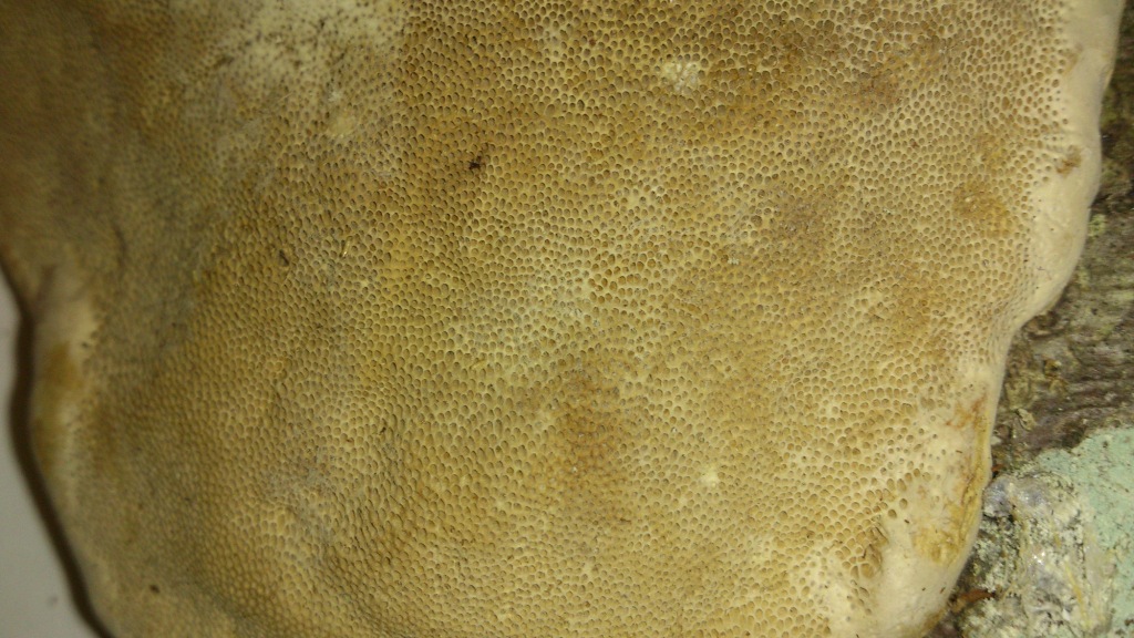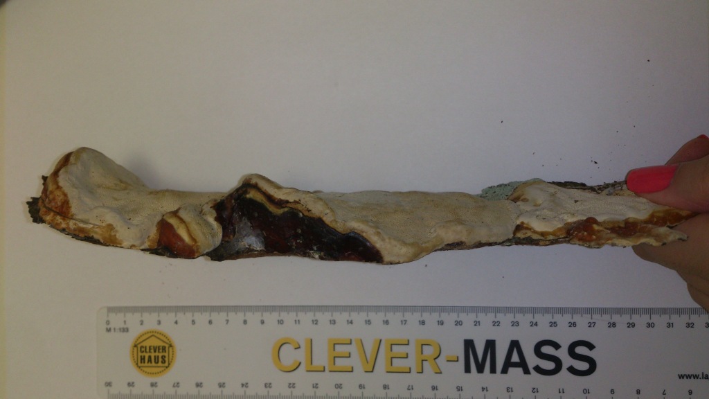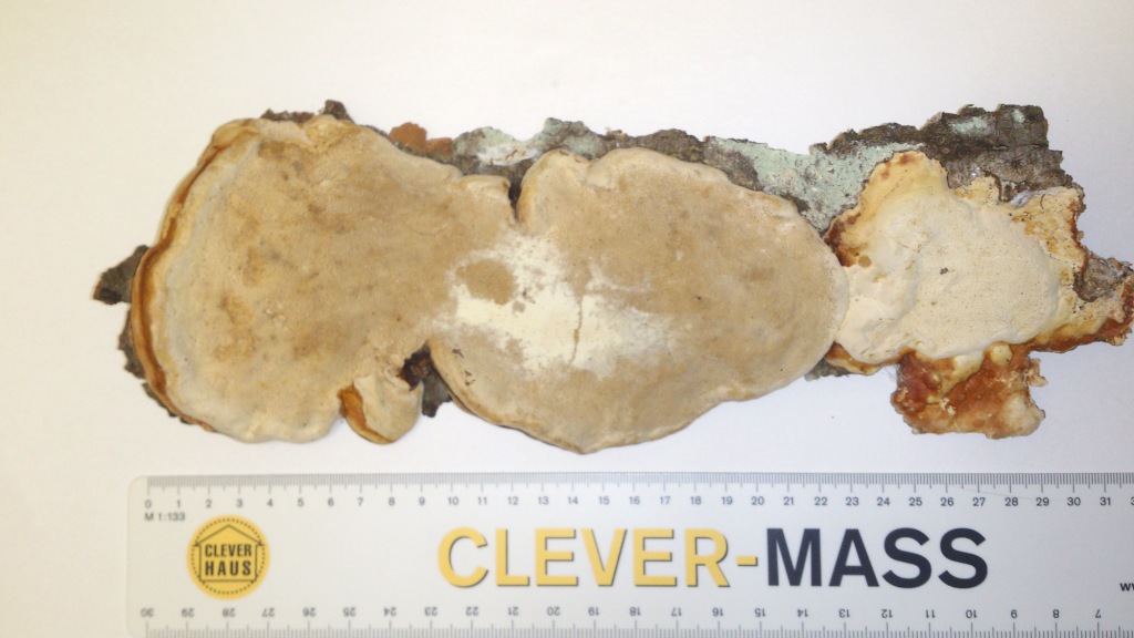 Der Pilz war wirklich fast unter einen Stamm, ich konnte nicht fotografieren. Die Trauma ist sehr dünn und die Röhrenschicht auch. Die Poren sind sehr klein und die Anheftungschicht konnte man nicht aus der Baum entfernen. Ich weiß es nicht, ob ich richtig alles erklärt habe. Außerdem habe ich auch an der Unibibliothek Literatur recherchiert und gab es keine ähnliche Art. Deshalb bewundere ich mich, was habe ich gefunden.