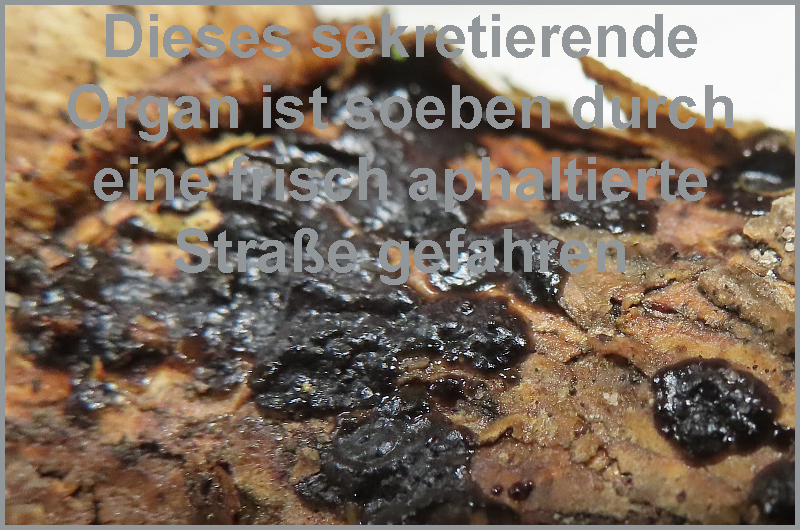 Bei mir ist Exidia pithya recht häufig. Die typische Borkenstruktur von der Kiefer ist auch gut zu erkennen, wobei die Art auch an Fichte vorkommt.