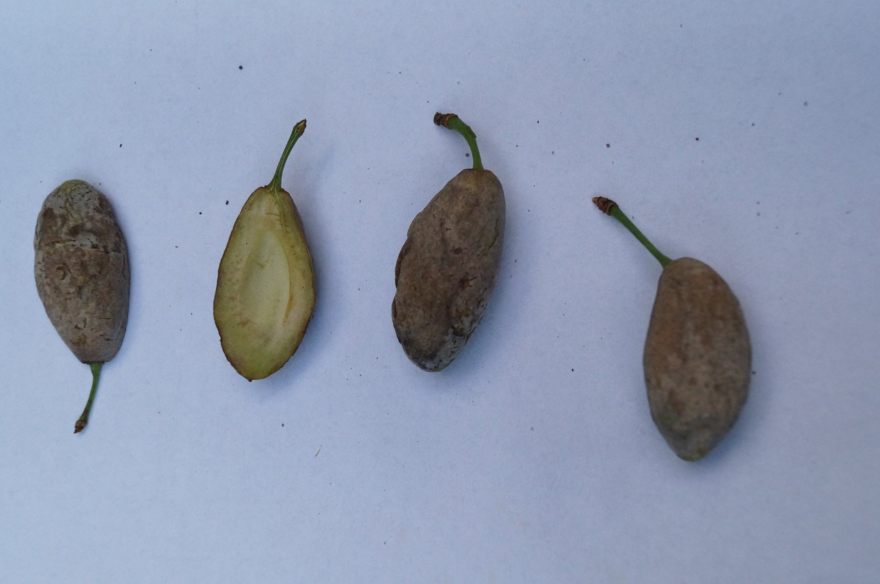 Taphrina pruni auf Hauspflaumen; inkl. Schnittbild der Früchte und Mikrobild.