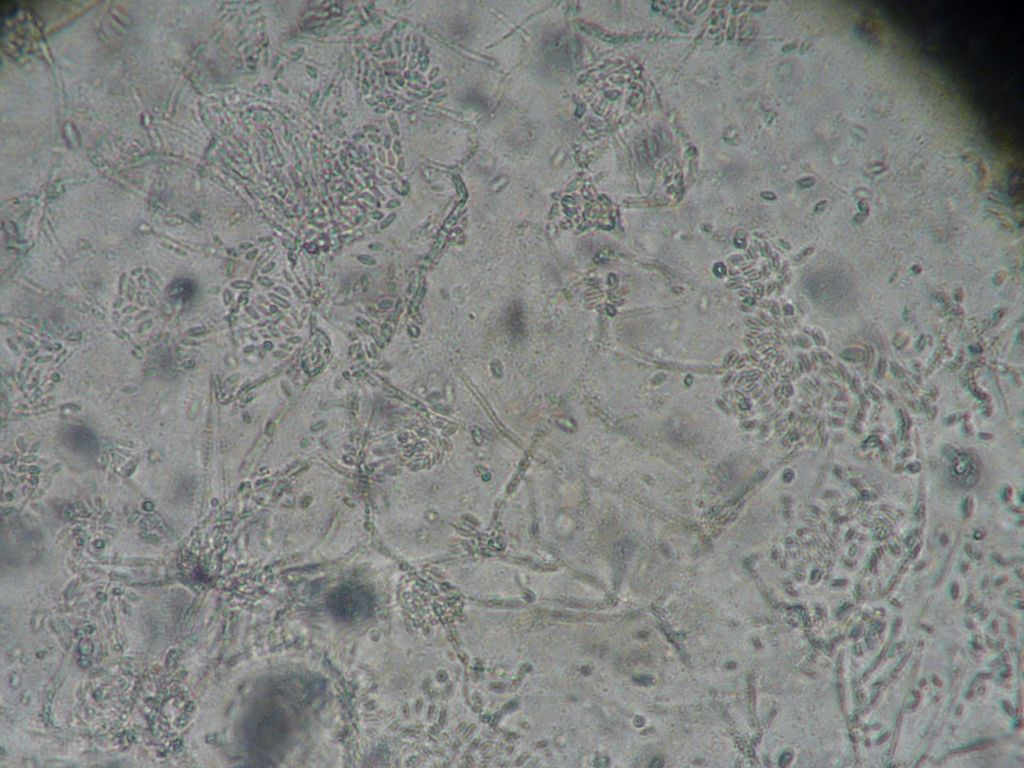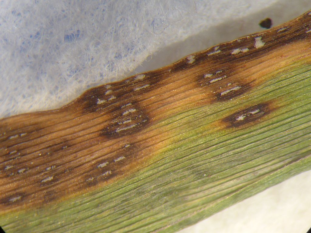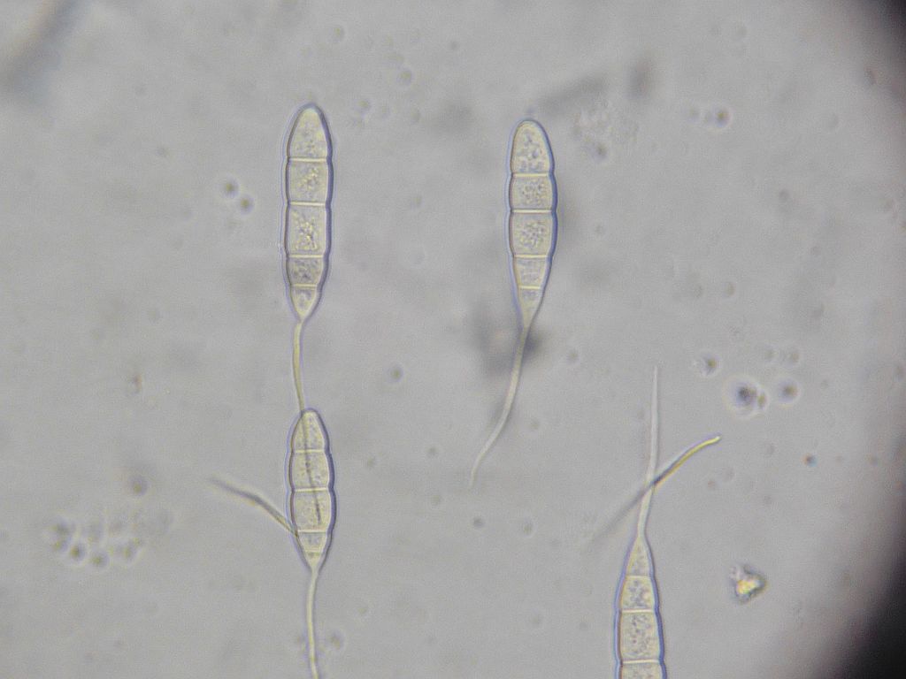 Wenn ihr diese Sporen nicht nachweisen könnt, dann legt die Blätter mal über Nacht in eine feuchte Kammer oder einen verschlossenen, aufgeblasenen Plastikbeutel mit ein paar Tropfen Wasser drin. Wenn dann keine Konidien nachweisbar sind, dann haben die Blattflecken andere Ursachen.