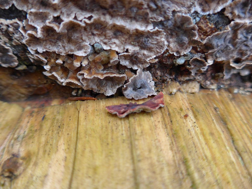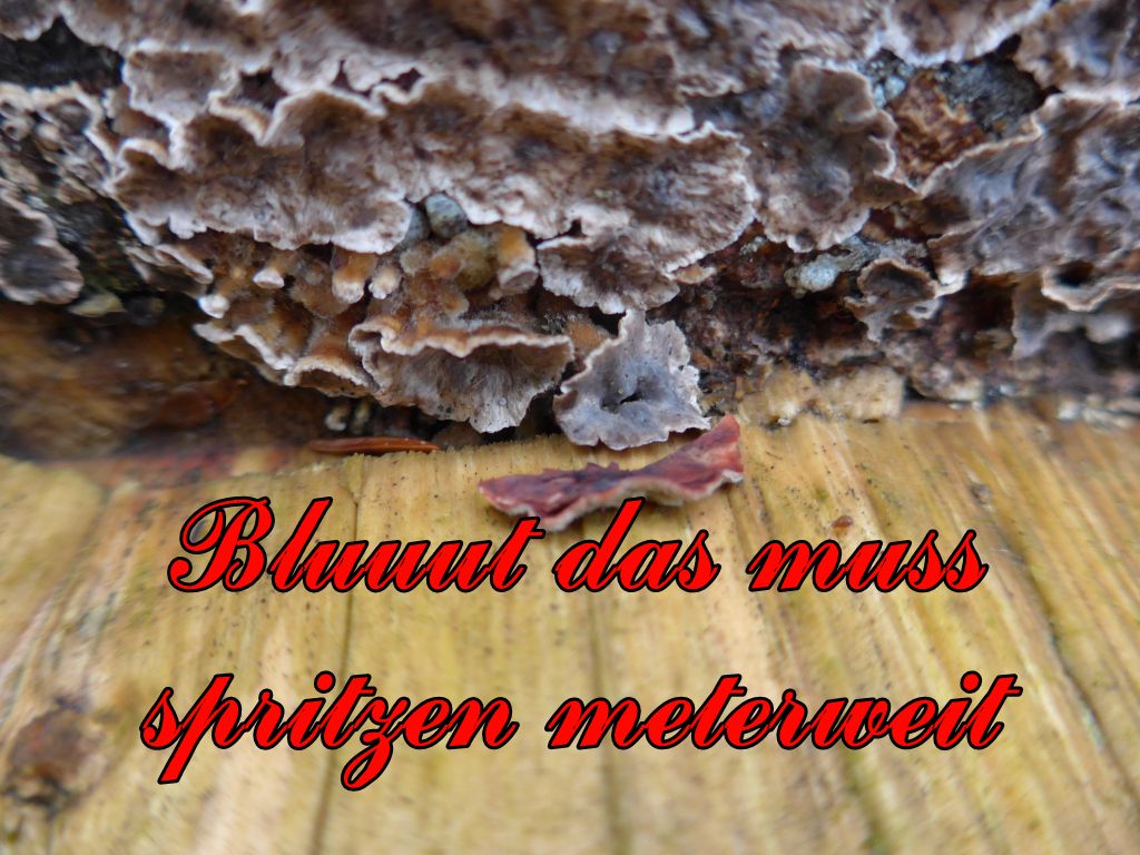 kommen wir zur lang erwarteten Auflösung. Spätestens nach dem Joker, war es euch allen klar. Es ist der Blutende Nadelholzschichtpilz Stereum sanguinolentum, einem sehr häufigen Pilz, der nur an Nadelholz wächst. Er befällt gerne Lagerholz und baut es recht schnell ab, so dass es schnell unbrauchbar wird. Es setzt sich da auch langsam eine interessante Bekämpfungsmethode durch. Das Lagerholz wird mit Phlebiopsis gigantea versetzt. Der Pilz soll das Wachstum vom Schichtpilz hemmen...