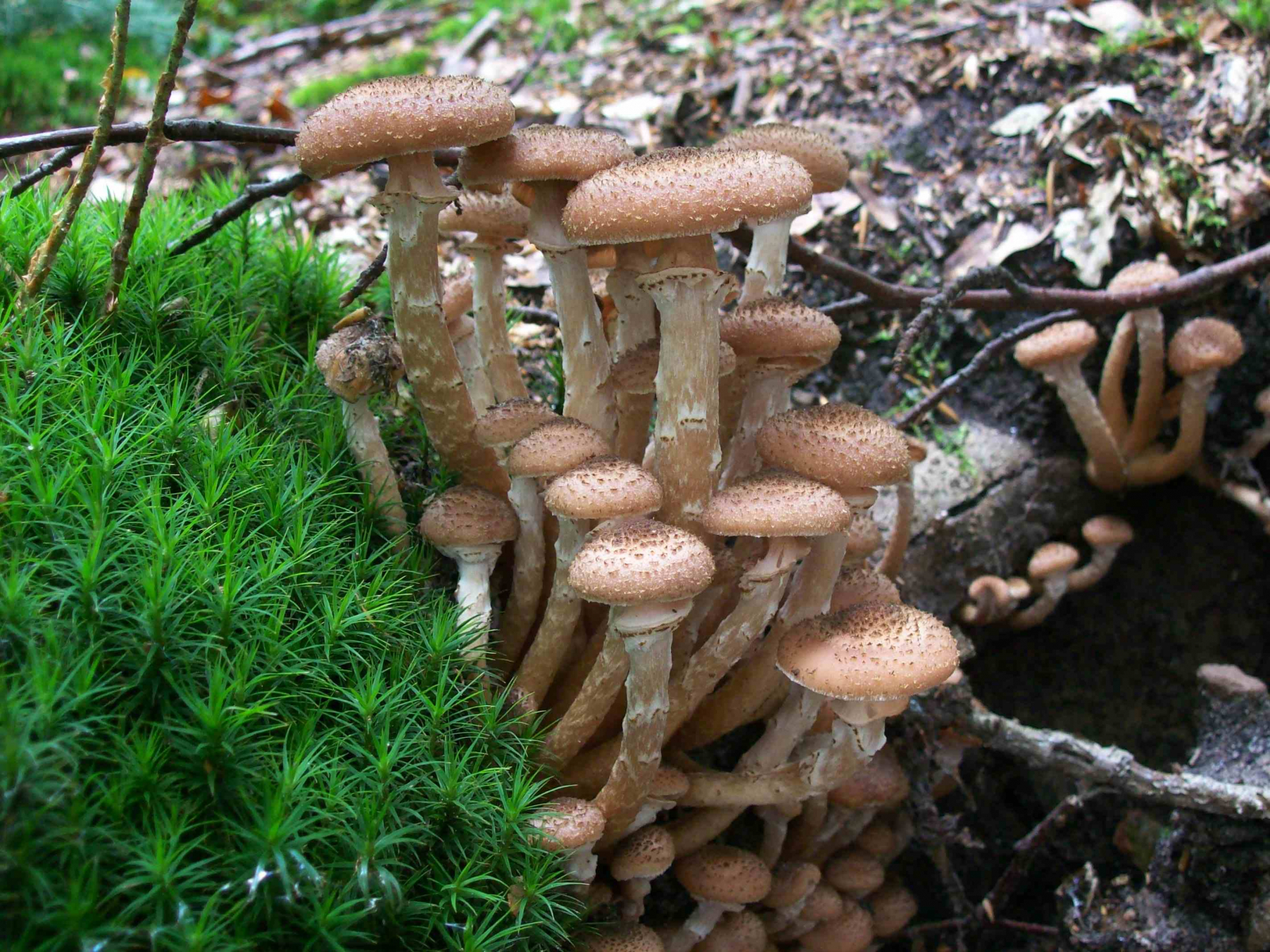 Schwarzschuppiger Hallimasch, Armillaria ostoyae. Von anderen Hallimasch-Arten unterscheidet er sich durch bräunliche Farben und schwärzliche Schuppen auf dem Hut und am Ring. Außerdem kommt er vor allem auf Nadelholz vor.