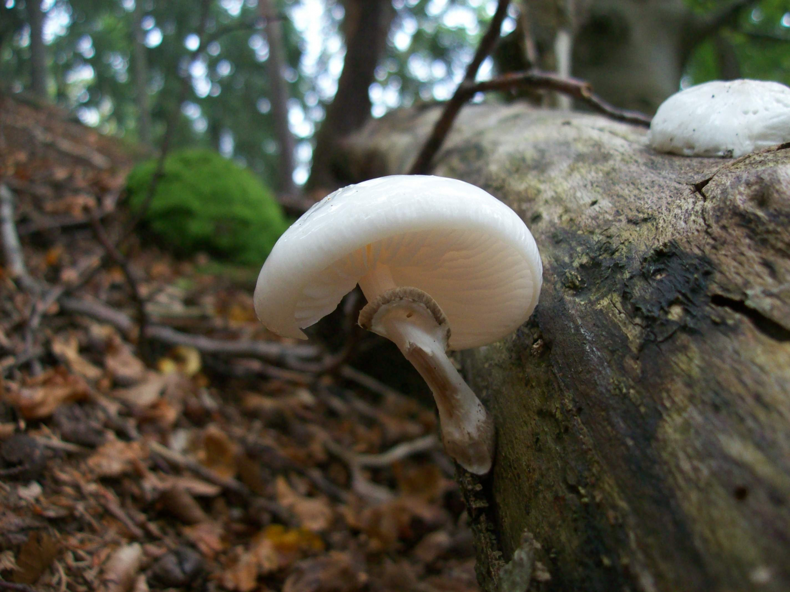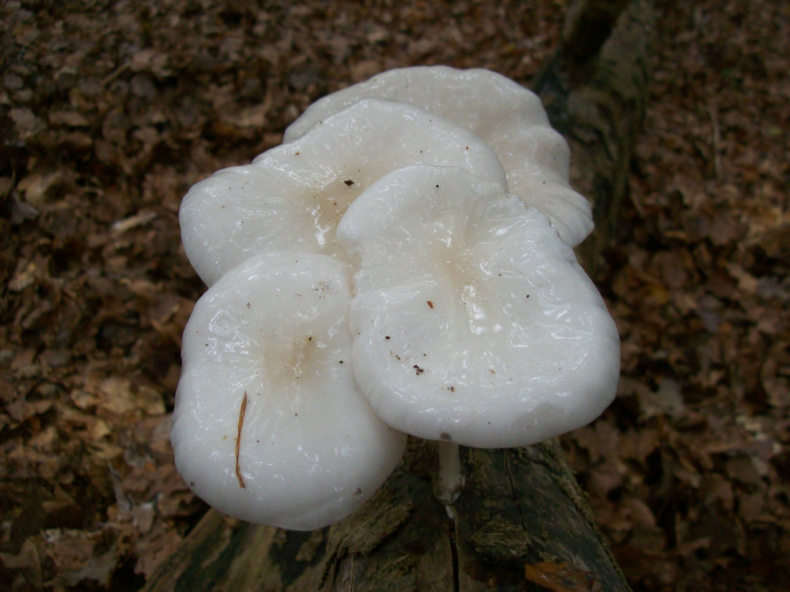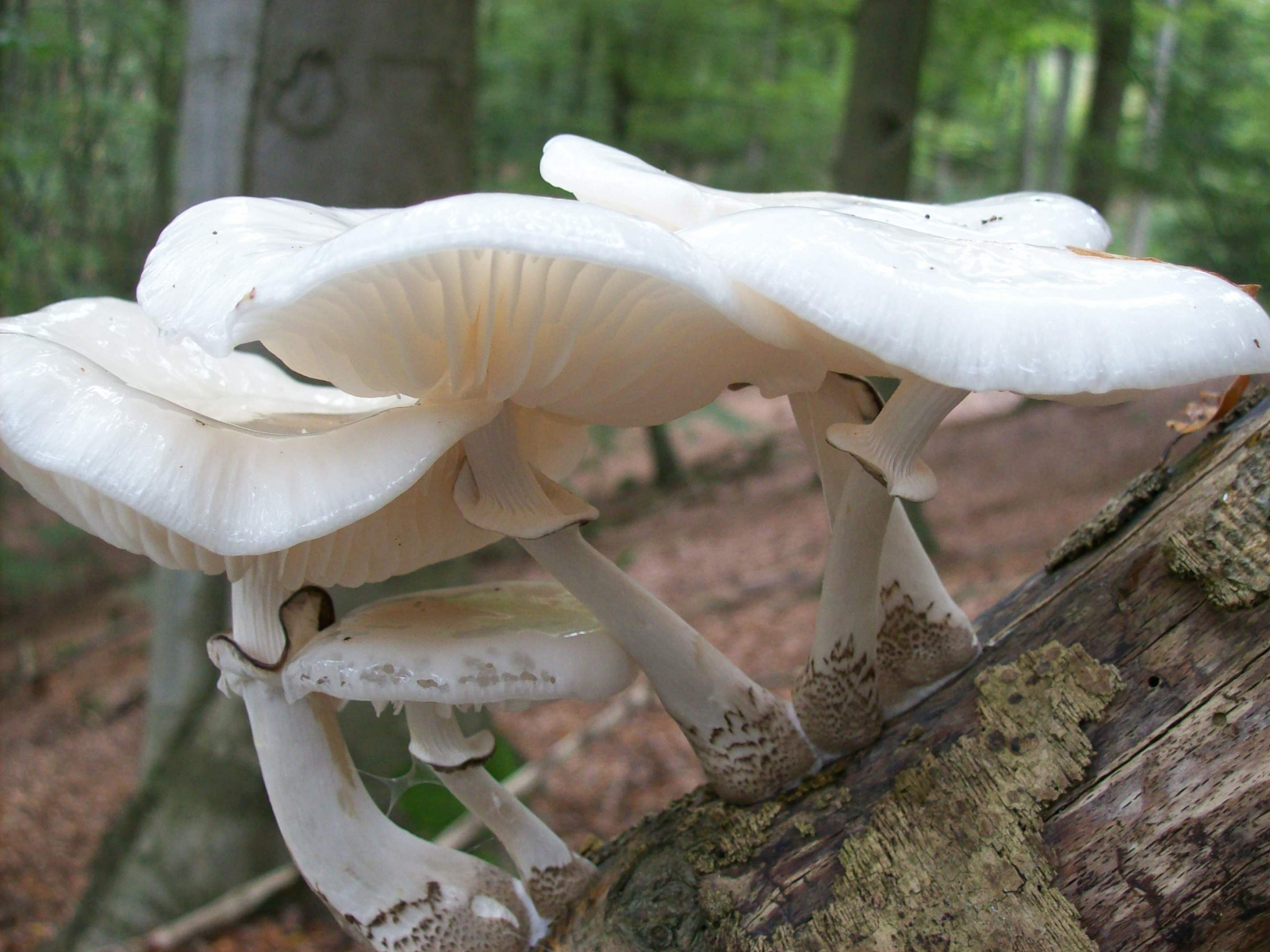 Buchen-Schleimrübling, Oudemansiella mucida. Perlweiß, schleimig, beringt und unverwechselbar.