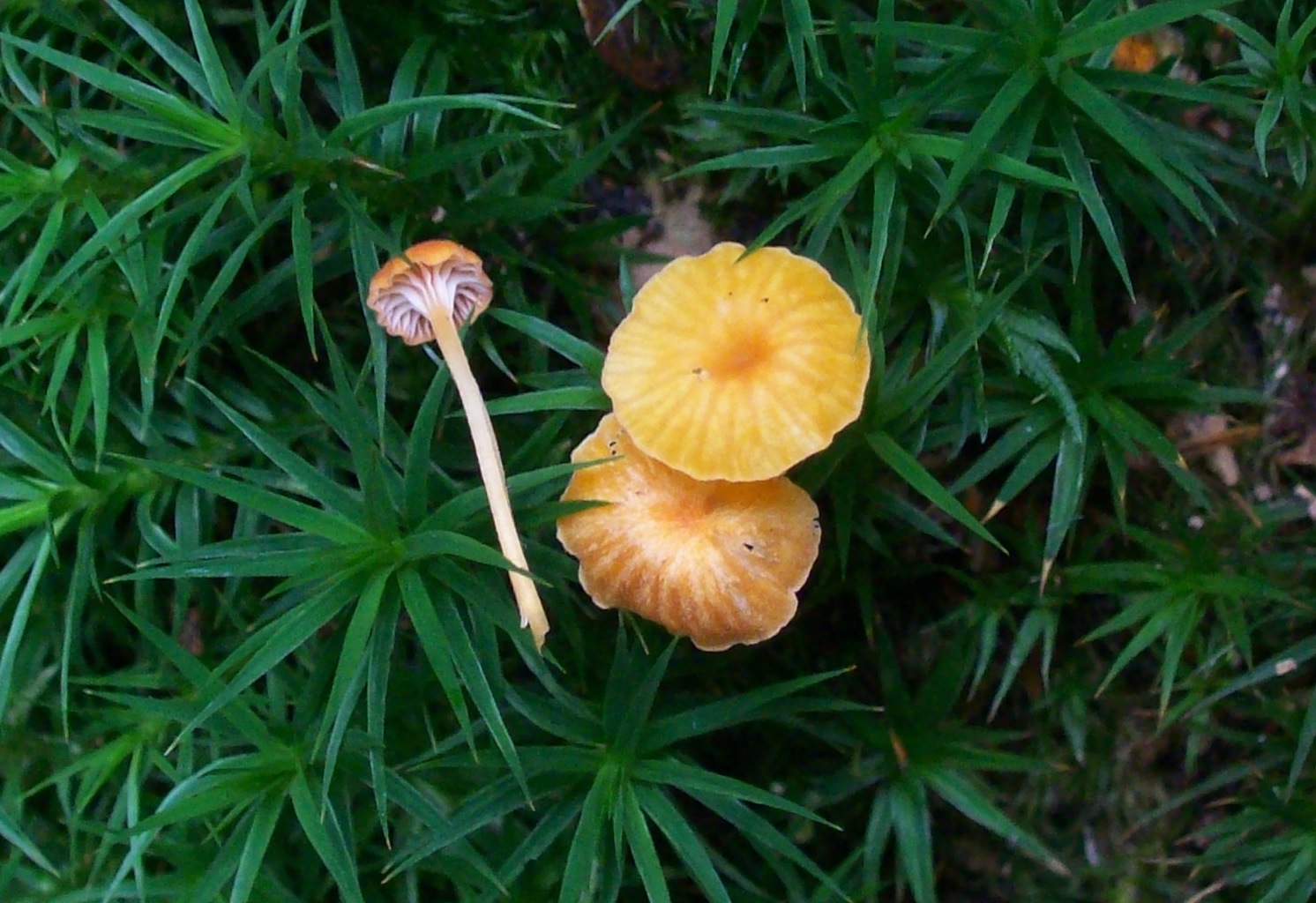 Orangeroter Heftelnabeling, Rickenella fibula. Durch das Wachstum im Moos, die geringe Größe, die orangeroten Farben und die herablaufenden Lamellen unverwechselbar.