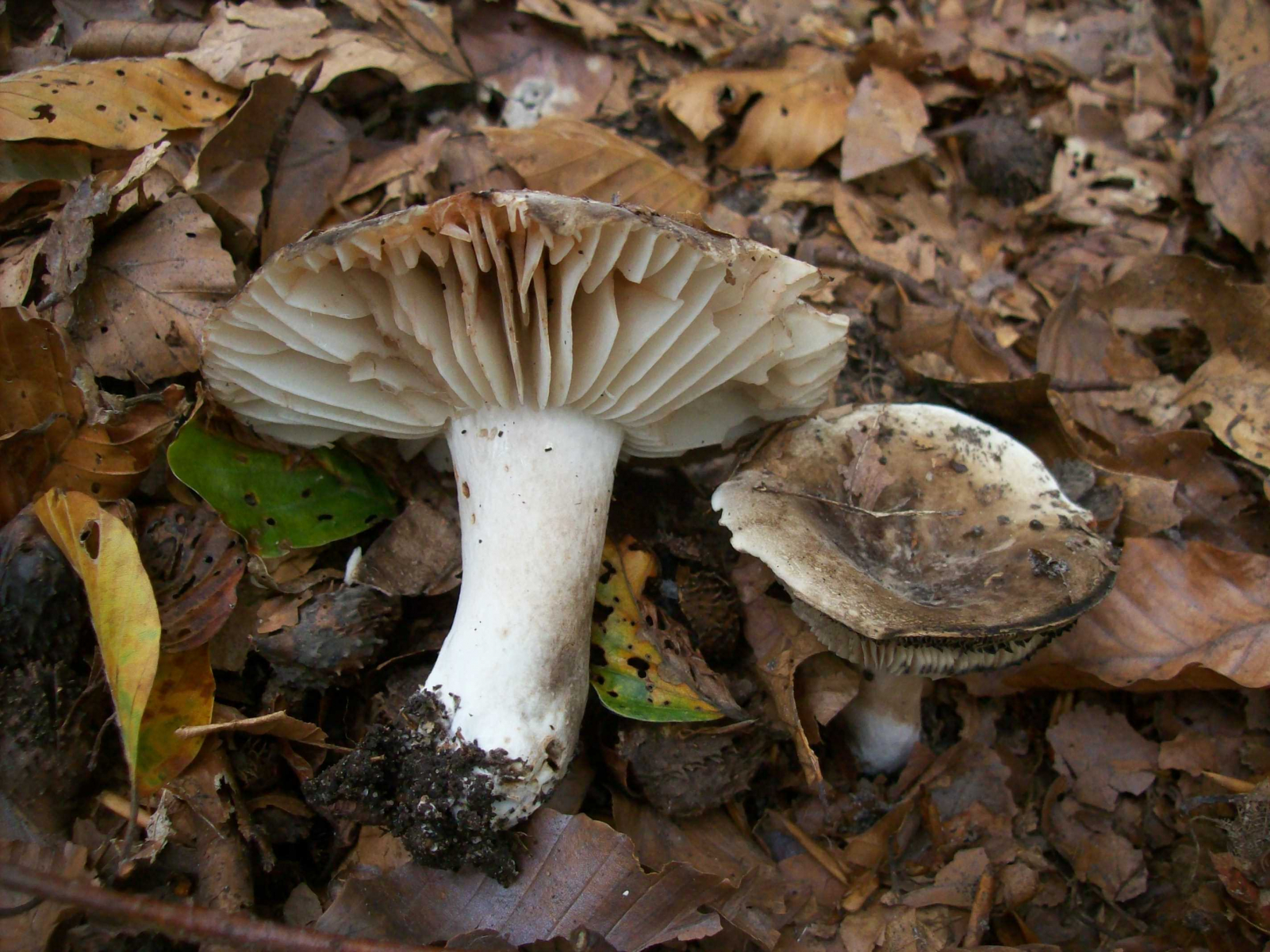 Dickblättriger Schwärz-Täubling, Russula nigricans. Erkennbar an den sehr entferntstehenden Lamellen und dem rötenden, später schwärzenden Fleisch.