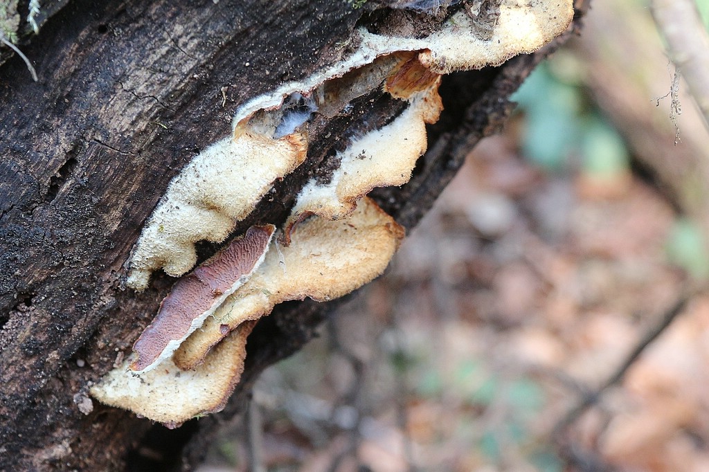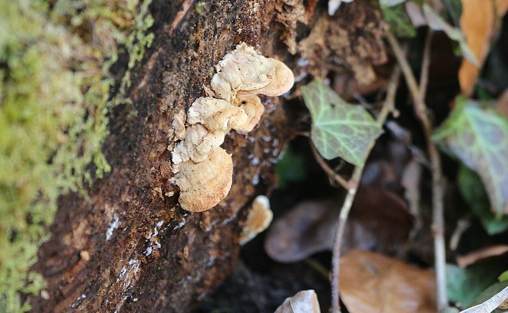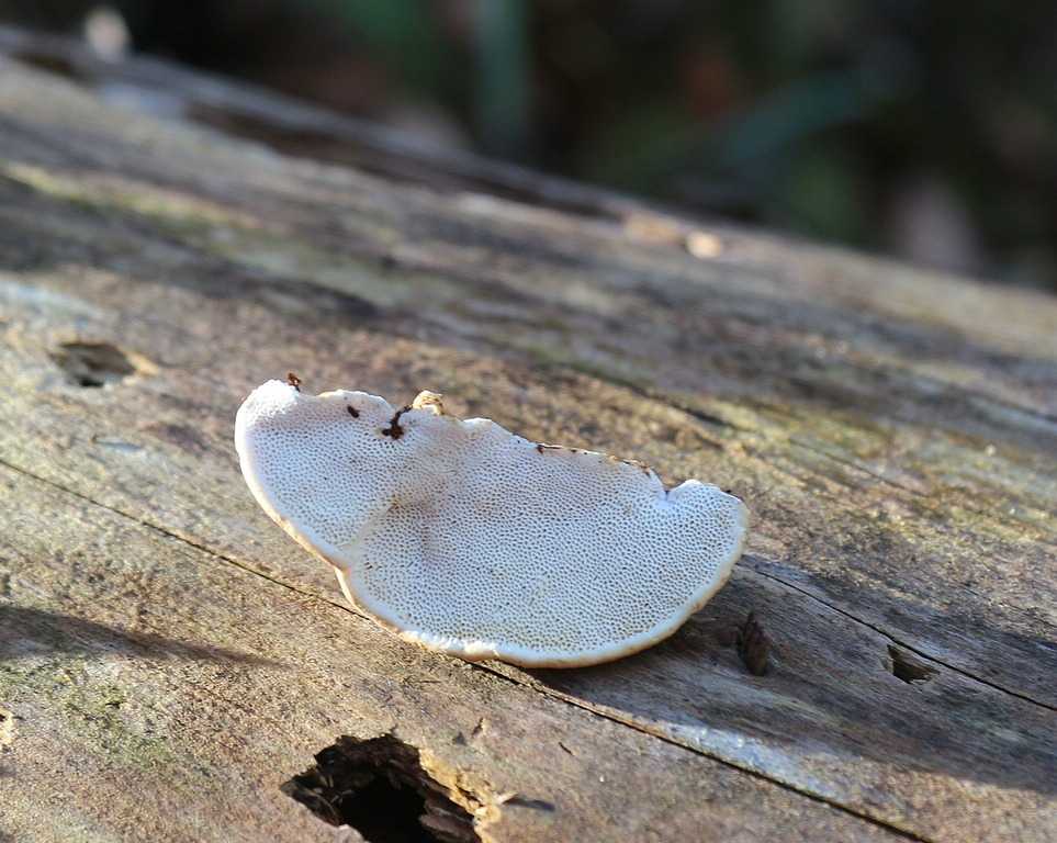 Und da ist er, der noch nicht identifizierte Pilzfund, ich tippe auf eine Tramete. Ein junges Exemplar an der Stirnseite einer Buche. Habe ich mitgenommen, mikroskopiert noch nicht,