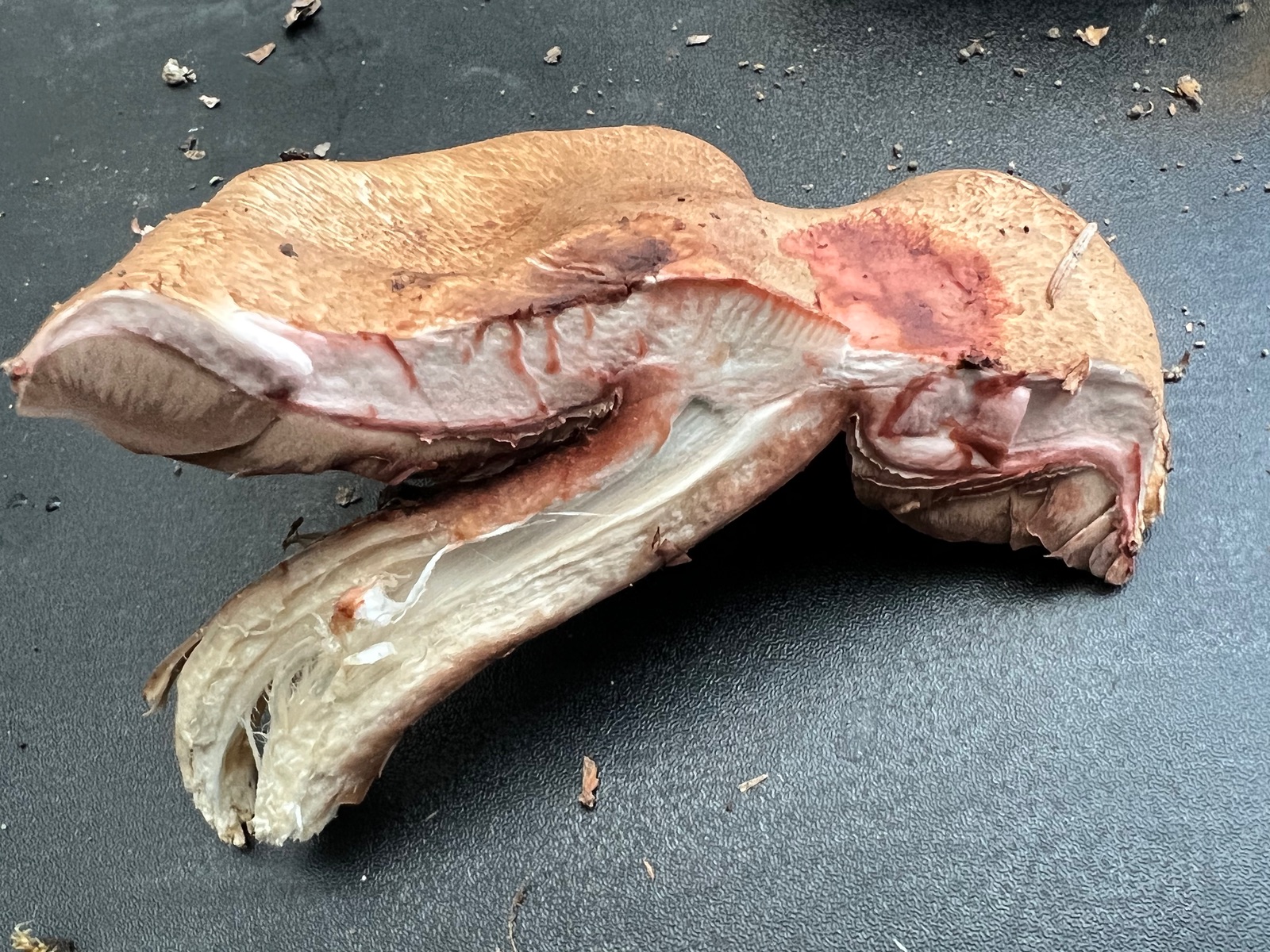Ich denke er gehört zur Gattung Amanita, obwohl die Lamellen eigenartig dunkel verfärbt sind.