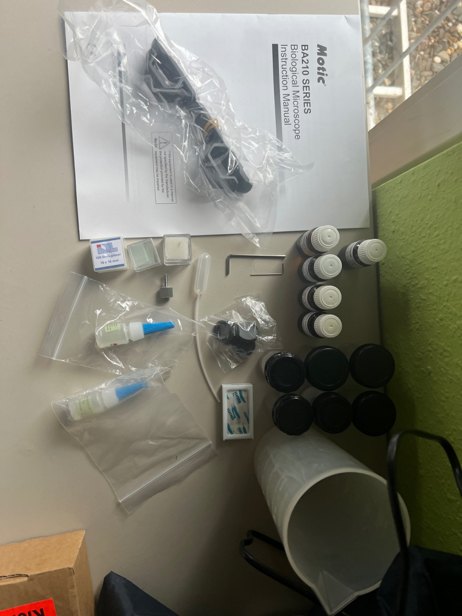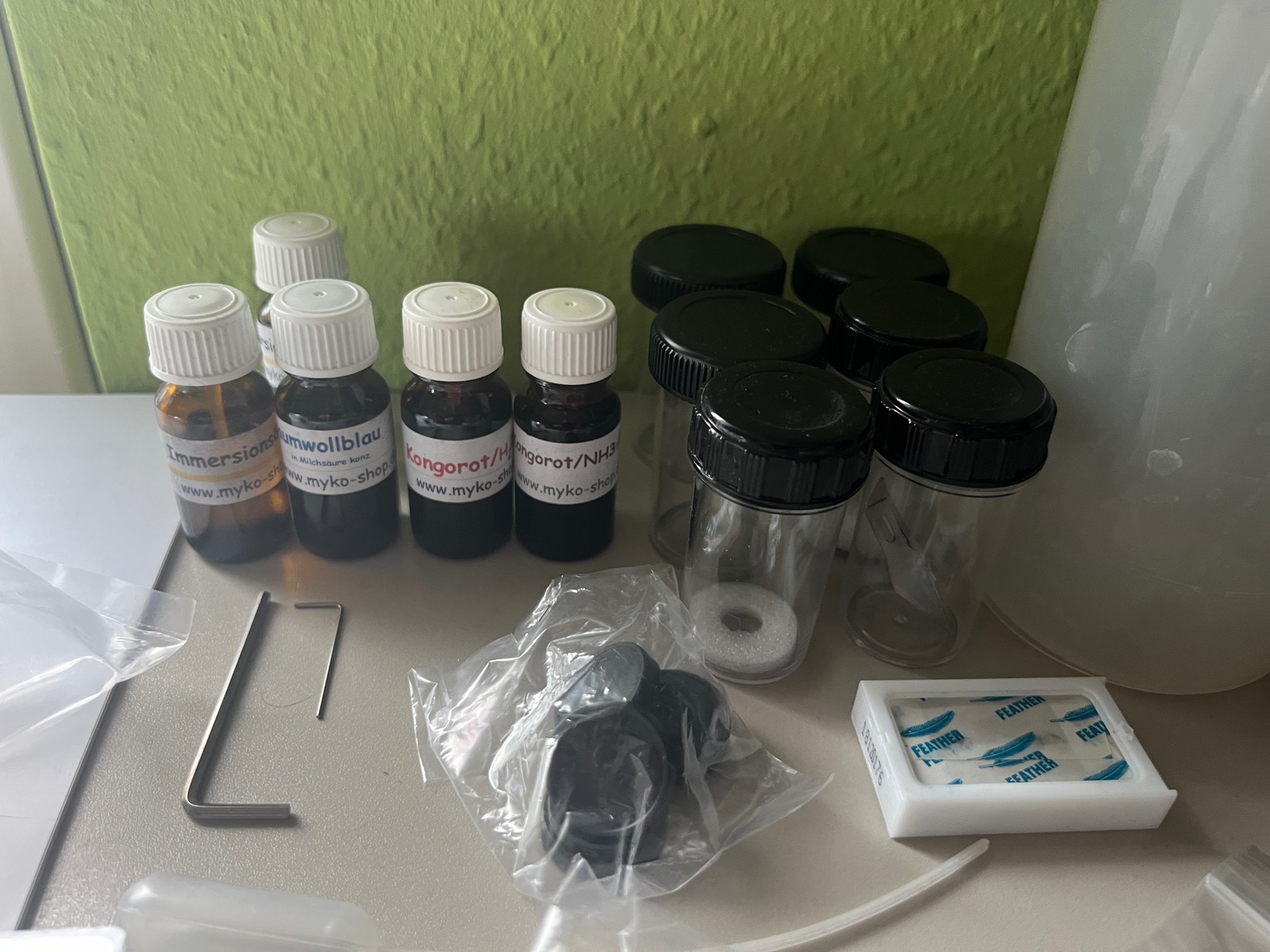 Chemikalien, Deckgläser etz gebe ich dazu (siehe Foto).