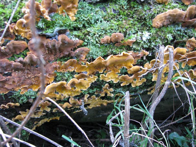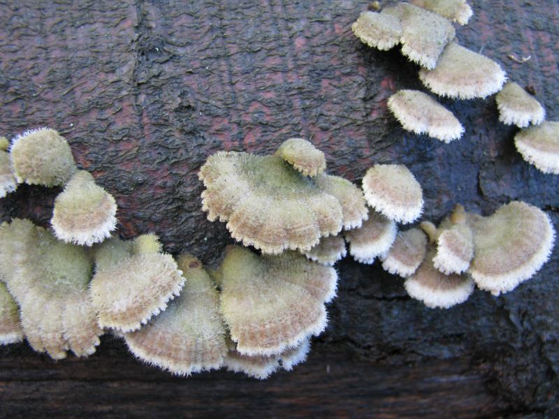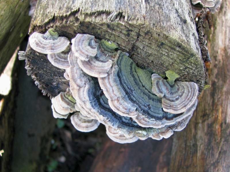da ich noch nicht sicher bin, daß ich Trametes versicolor jetzt fehlerfrei erkennen kann, nochmals 7 Bilder. Die Bilder 1 - 4 gehören zu einer "Kolonie" an einem Baumstamm, Bilder 5 - 7 zu einer zweiten Kolonie an einem anderen Stamm.