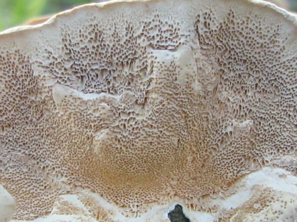 Anbei noch 4 Bilder, die ich gestern gemacht habe; die ersten beiden zeigen die Unterseite eines Pilzes von Bild 2, die zweiten die Unterseite eines der bodennahen Pilze auf Bild 3. Vielleicht kann man jetzt etwas Genaueres zu den Arten sagen. Und wenn ich etwas für Andere Offensichtliches mal übersehen sollte, liegt das daran, dass ich mich um Baumpilze bislang nicht gekümmert habe und da absoluter Laie bin.