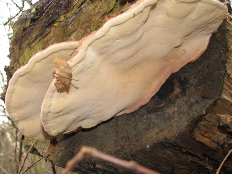 ein weiterer Baumpilz,Länge von linker Seite linker Pilz bis rechte Seite rechter Pilz etwa 30 cm, an einem abgestorbenen Weiden-Stamm. Könnte das der Rotrandige Baumschwamm, Fomitopsis pinicola, sein?