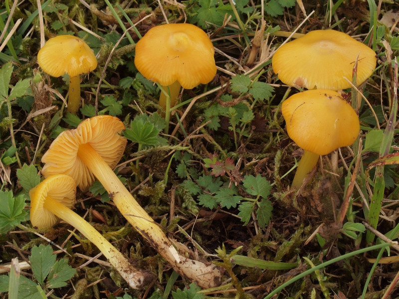 Ebenfalls mehrfach an Wegrändern der Safrangelbe Saftling (Hygrocybe acutoconica s. str.)