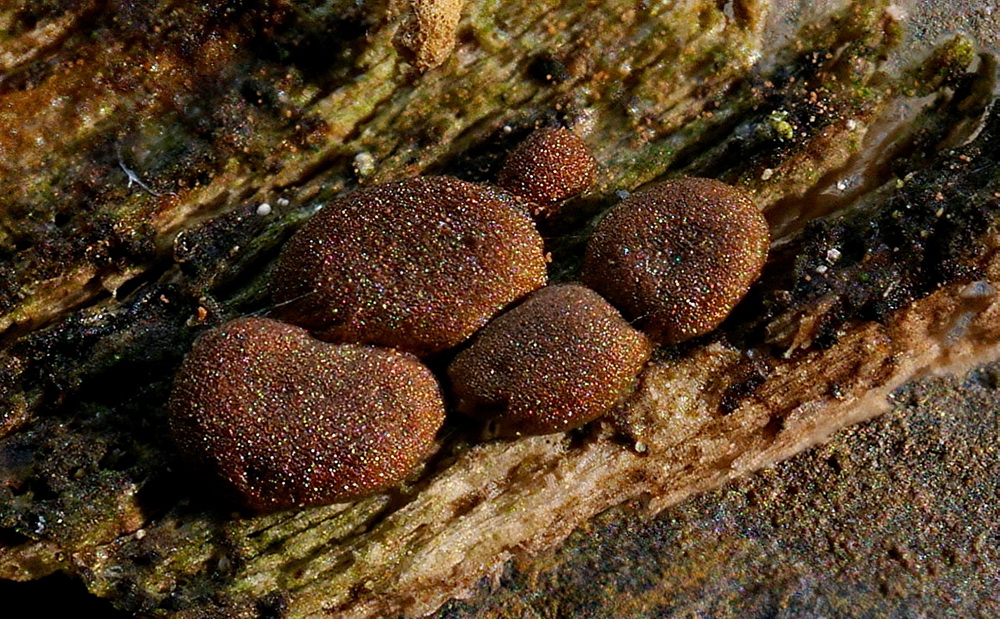 Hier hat es nicht mehr zum Auflagern von Kalk gelangt. Mit der runzligen Peridie sieht das fast wie eine Licea aus, aber wenn man einen Sporocarp aufmacht, sieht man das typische Capillitium.