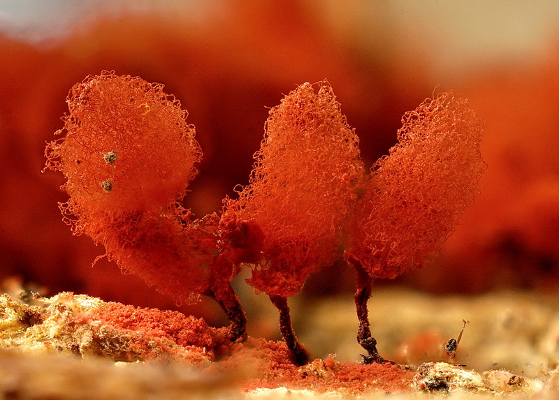 Der alte Name ist Tubulina ferruginea. Im Gegensatz zu T. dictyoderma sind die Einzelsporocarpien hier noch deutlich zu erkennen.