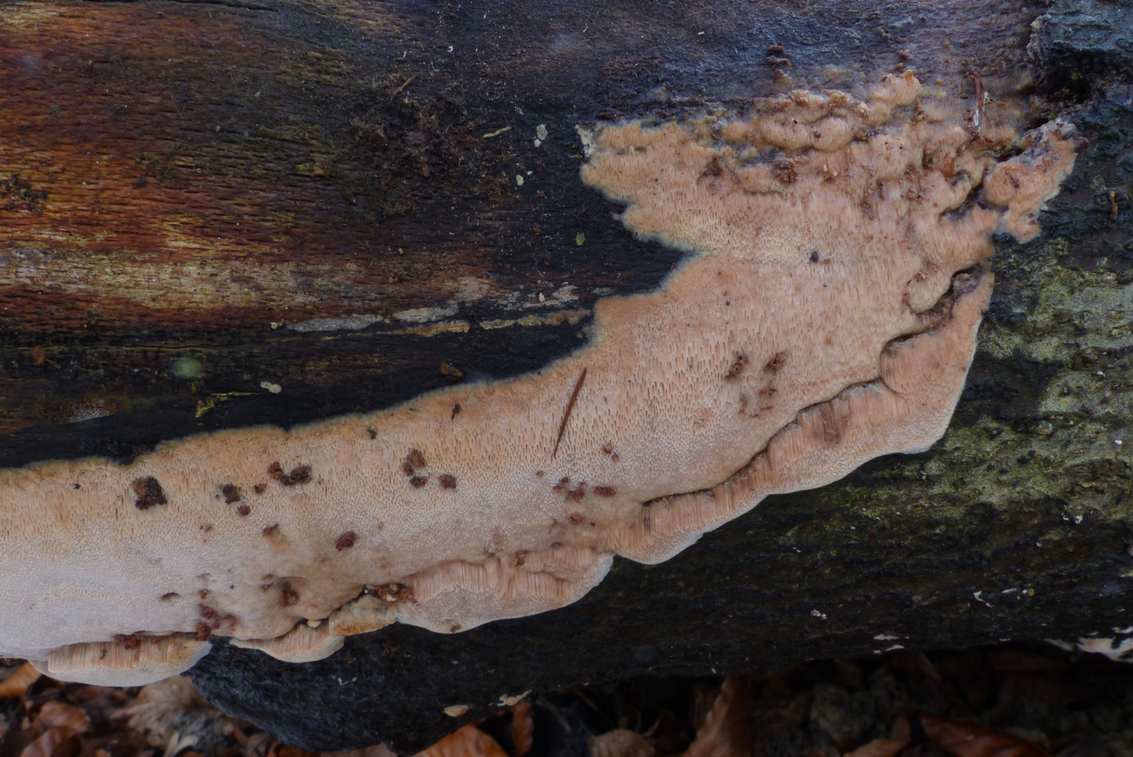 Ceriporiopsis gilvescens könnte für deinen ersten Pilz gut passen. Ich habe ihn Mitte Dezember in der Schweiz gefunden, ebenso wie ein Pilzkollege. Der Pilz, der eher als selten gilt, hat vielleicht ein besonders gutes Jahr.