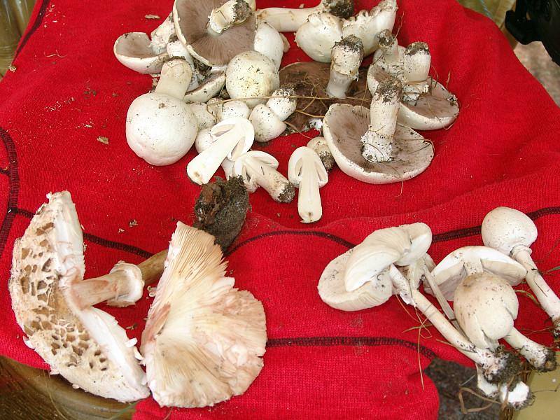 Bei den im oberen Bereich erkennbaren Pilzen müsste es sich nach allem was ich weiss eindeutig um Champignons handeln - genauer Schafchampignons. Alle duften mehr oder weniger nach Anis und bei ALLEN sind die Lamellen dunkler als das Fruchtfleisch selbst - bei den jüngeren werde ich dies noch kontrollieren.