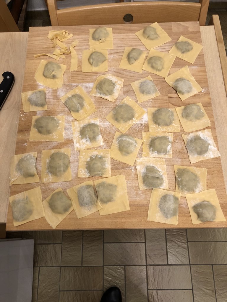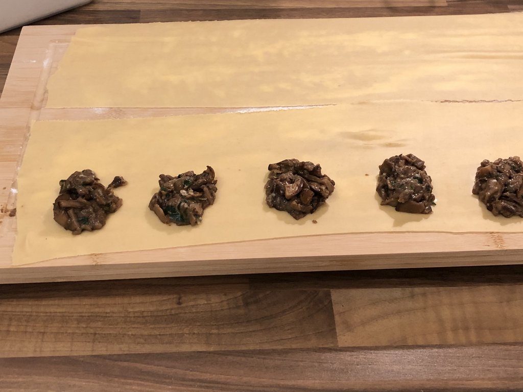 Nun den Teig mit der Nudelmaschine ausrollen. Wer damit noch keine Erfahrung hat: Immer mit der gröbsten Einstellung anfangen und dann immer nur um eine Stufe reduzieren. Auf den niedrigen Stufen mehrfach durchdrehen, den Teig mehrfach mindestens auf die Hälfte zusammen legen (oder mehrlagig) und wieder bei der gröbsten Stufe anfangen, bis der Teig einen völlig homogenen Eindruck macht und keine Streifen mehr zeigt. Dann so weit immer feiner durchdrehen, bis der Teig wirklich dünn ist. Bei mir ist das die vorletzte mögliche Stufe. Die Teigplatten auf eine ganz leicht bemehlte Holzfläche legen, die Füllung auf einer Hälfte wie auf dem Foto drauf drapieren, die Zwischenräume und Ränder auf dieser Seite mit Wasser bestreichen und die andere Hälfte darüber klappen. Ganz vorsichtig den Teig andrücken, sodass möglichst keine Luft eingeschlossen wird. Dann mit einem Messer trennen und die Ränder nochmal nacharbeiten, damit sie beim Kochen garantiert nicht auseinander gehen.