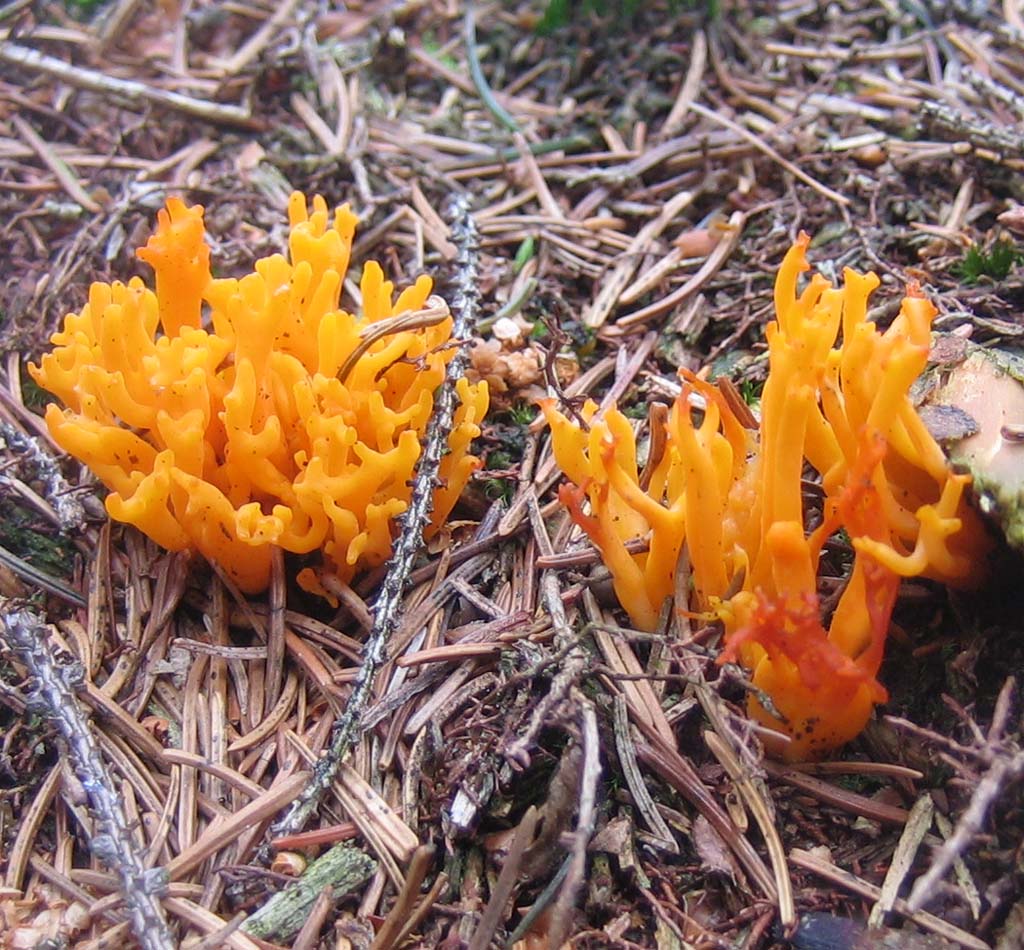 Das was immer wächst. Klebrige Hörnling (C. viscosa), breitblättriger Rübling (M. platyphylla) und ein Porling an toter Fichte, der mir nicht einfällt. Wurde mir aber schon mal auf einer Exkursion vorgestellt.