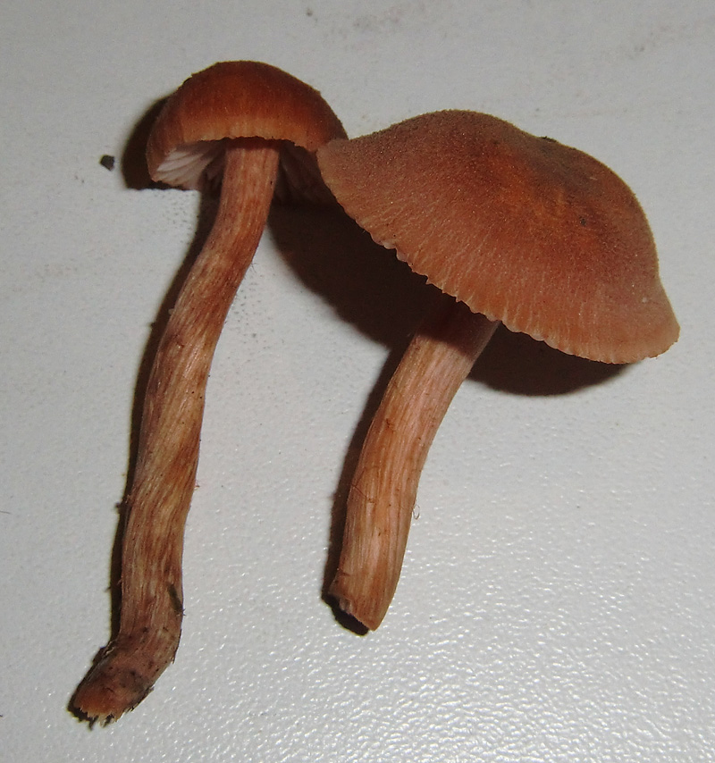 1. Einzeln in kleinen Gruppen stehend; Farbe: braun, rostbraun, rosa; Hut: 1 - 3 cm, leicht schuppig, etwas gezont; Stiel: 3 - 6 cm, verdreht; Sporenpulver: weiß