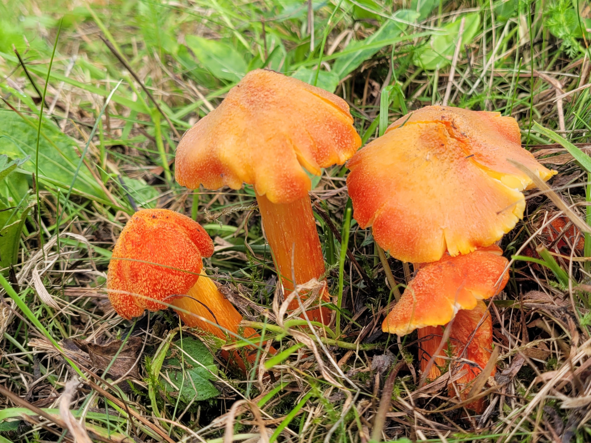 Und ab und zu Überraschungen. Eine frisch gemähte Wiese, bestenfalls halbmager. Praktisch keine Pilze. Und dann ein orangener Fleck mitten drin: