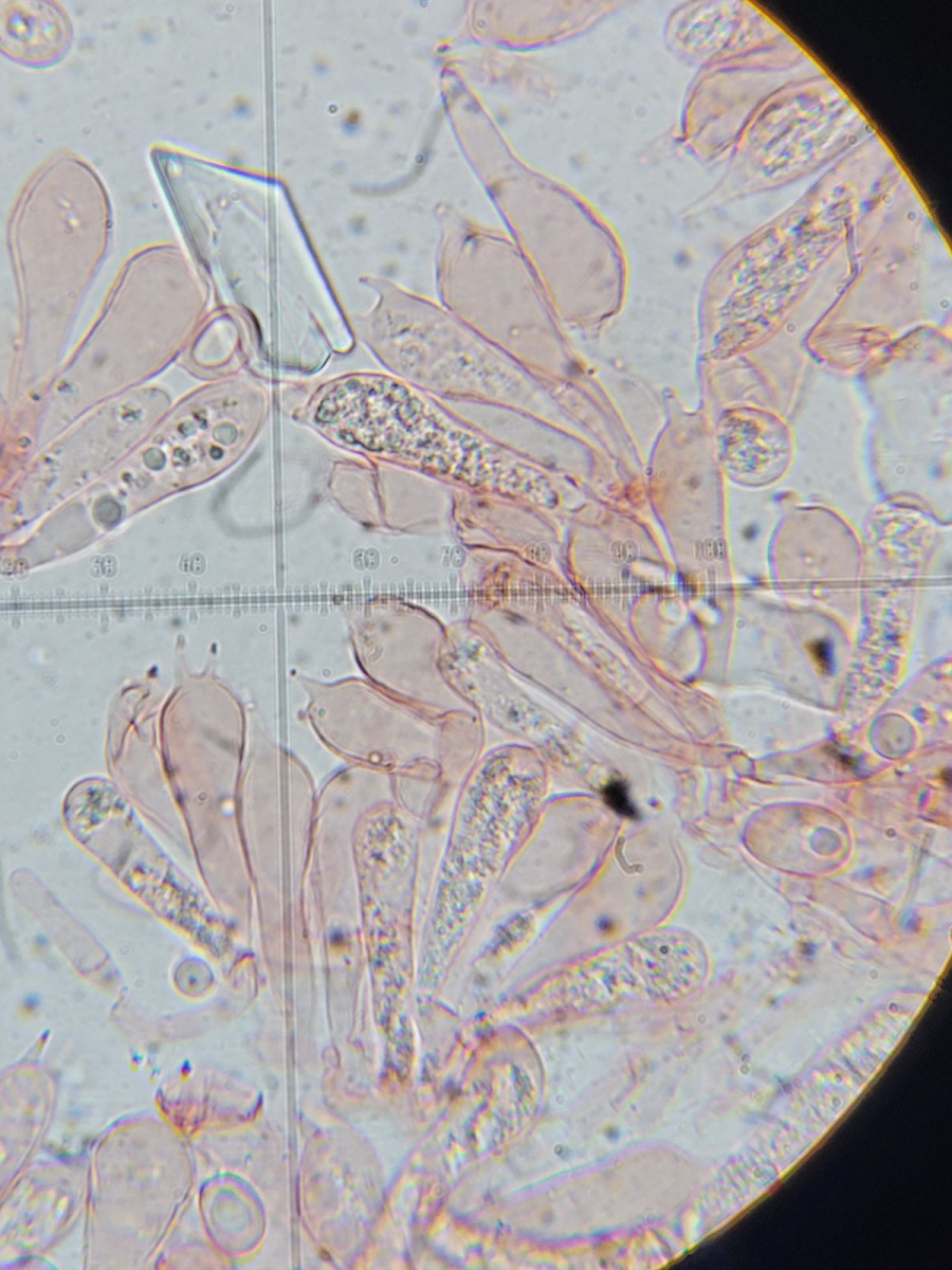 die Basidien sind bei den Saftlingen eigentlich nicht bestimmungsrelevant. Wichtiger ist der Lamellenansatz auf makroskopischer Ebene und die Lamellentrama auf mikroskopischer Ebene.