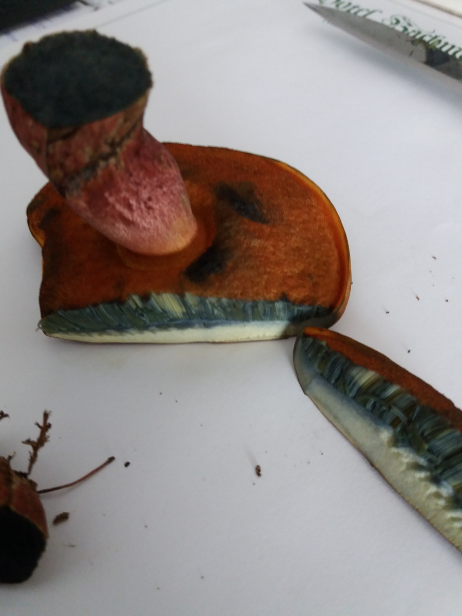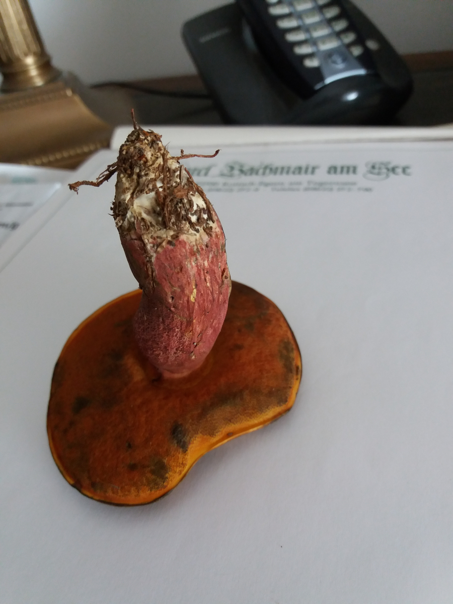 Stiel: ca. 18mm, rötliches längsverlaufendes Netz, sofort stark bläuend bis schwarz bei Anschnitt, wir dann graugrün mit der Zeit.