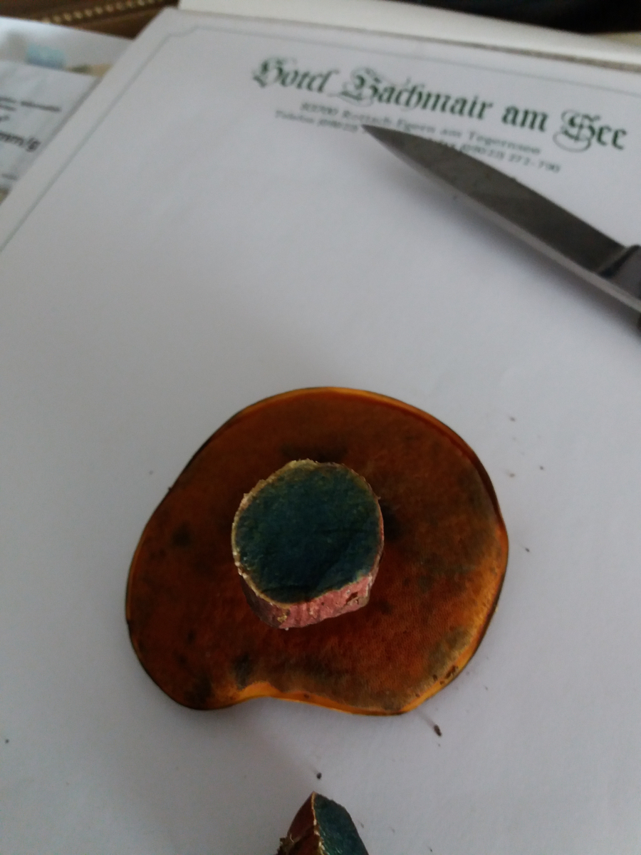 Röhren sehr fein, Farbe Orange, stark bläuend bei Anschnitt, wir dann graugrün mit der Zeit.