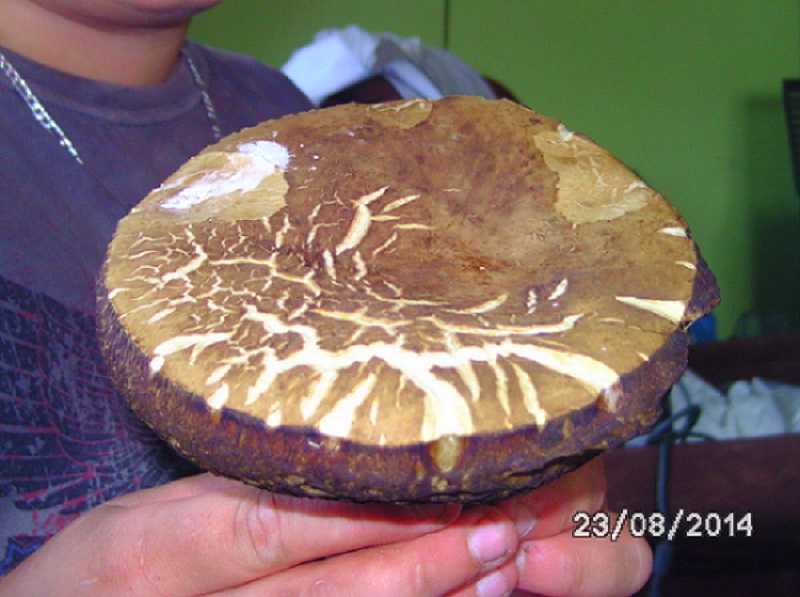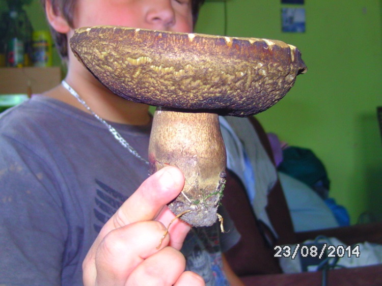 Der Hut des Pilzes hat einen Durchmesser von etwa 12 cm,der Stiel ist 7 cm lang und wird nach unten hin dick.