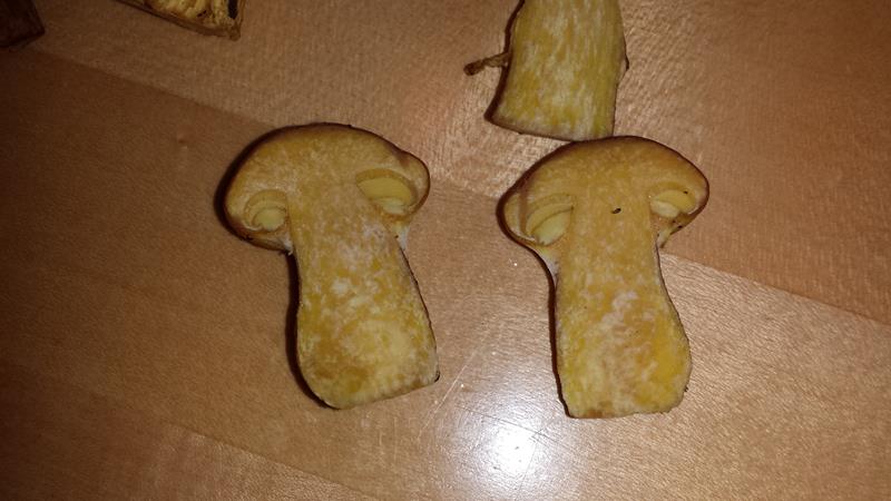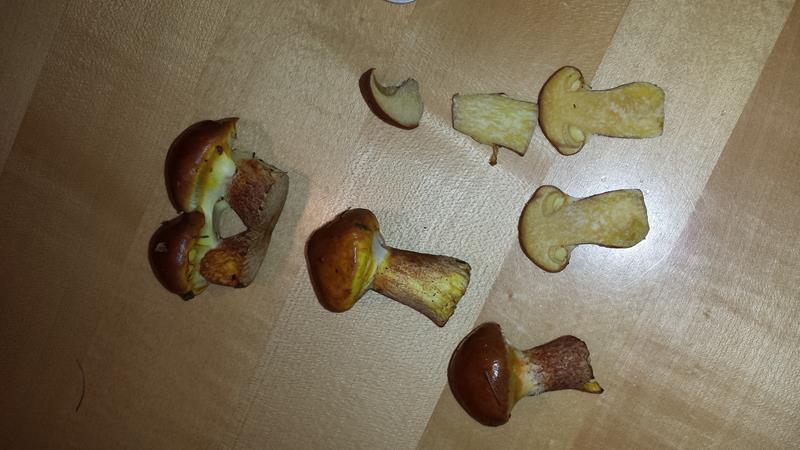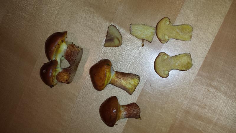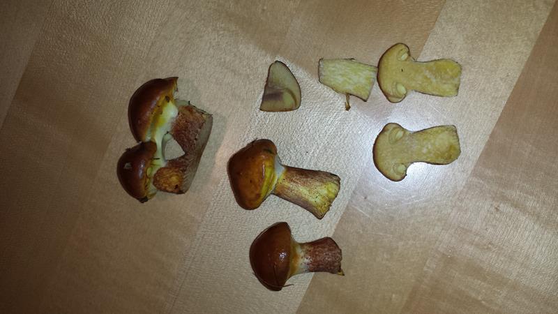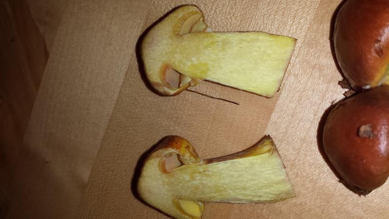 Der Hut hatte beim finden eine rötlich braune, leicht orangene Farbe. Feucht und schmierige Oberfläche. Auch jetzt noch leicht schmierig.Röhren gelblich, Fleisch im Stiel und im Hut nach anschnitt sehr gelb, jetzt, nach ca. 1 Std. , immer noch leicht gelblich, weis.