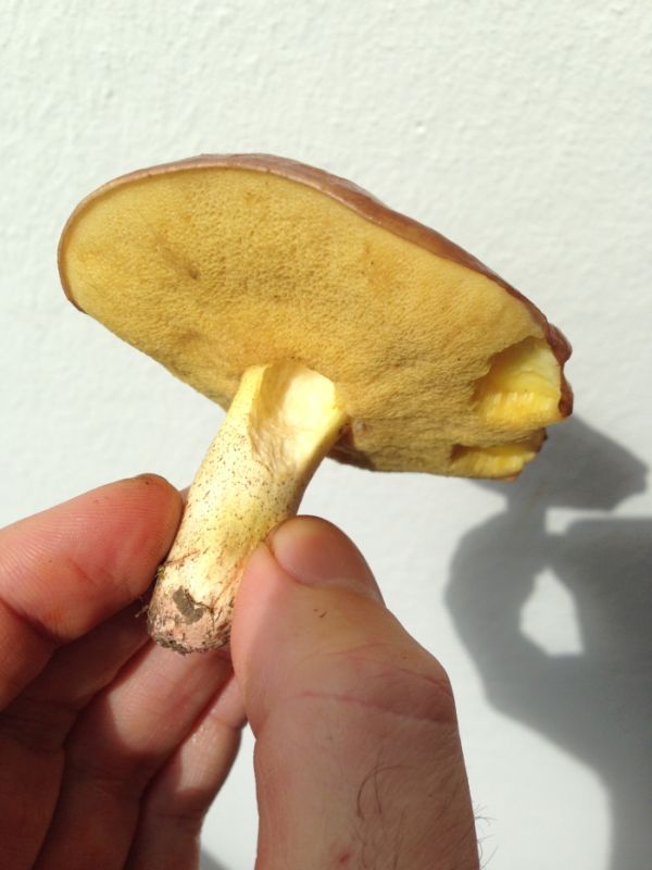 Die Röhren sind gelb (verfärben sich nicht), das Fleisch weißgelblich. Der Stiel ist dünn, gerade und sieht ebenfalls leicht gelblich aus und ist "gesprenkelt".Den Geruch des Röhrlings würde ich als angenehm pilzig beschreiben. Wenn ich mit der Zunge an das Fleisch gehe, dann fiel mir ein leicht säuerlich, zitroniger Geschmack auf.
